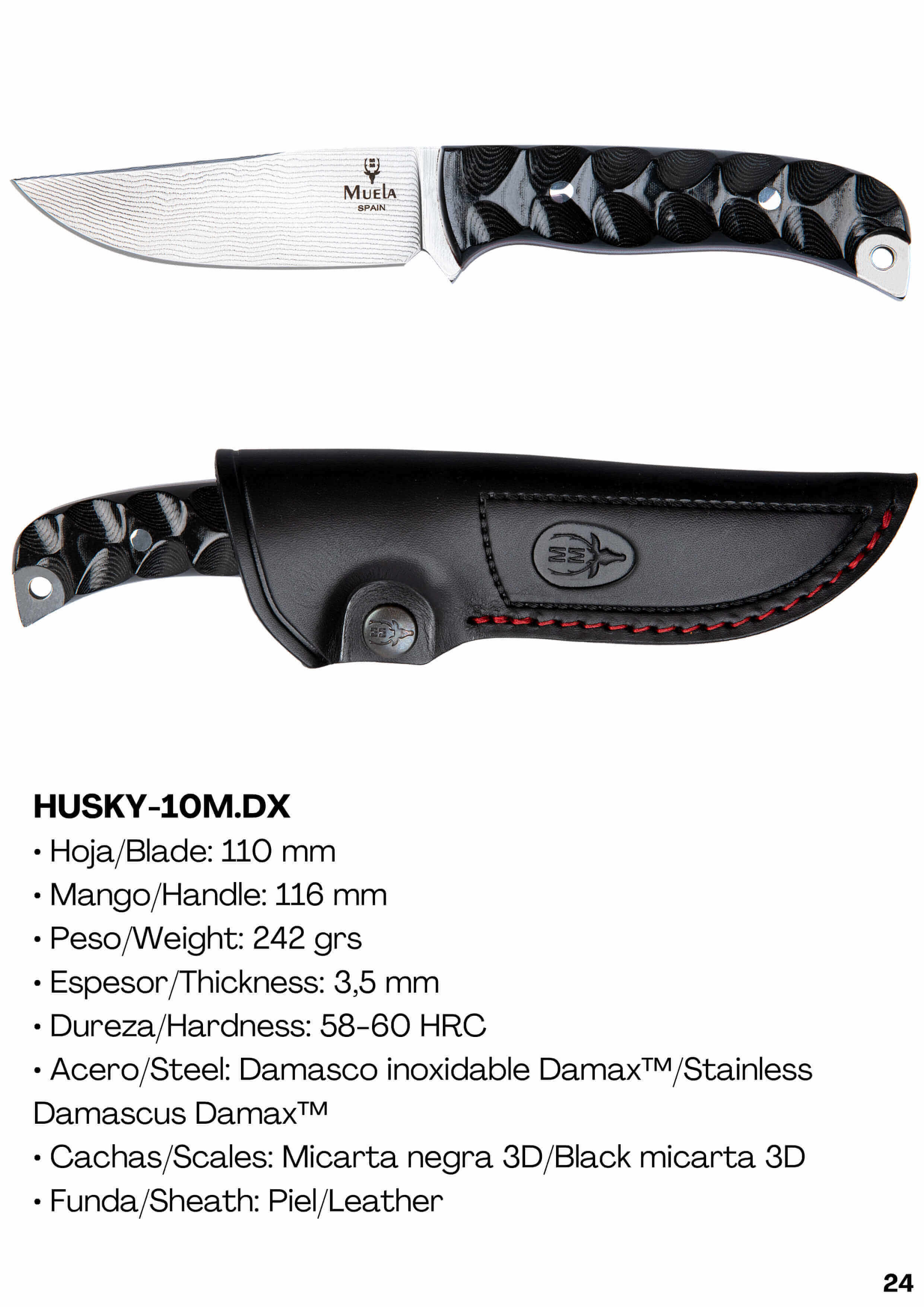 Cuchillo Husky-10M.DX con hoja de acero damasco y mango de micarta en 3D. Cuchillo perfecto para coleccionistas y amantes de los cuchillos de lujo, además de ser un cuchillo totalmente práctico a la hora de utilizarlo en el mundo exterior y actividades como la caza.