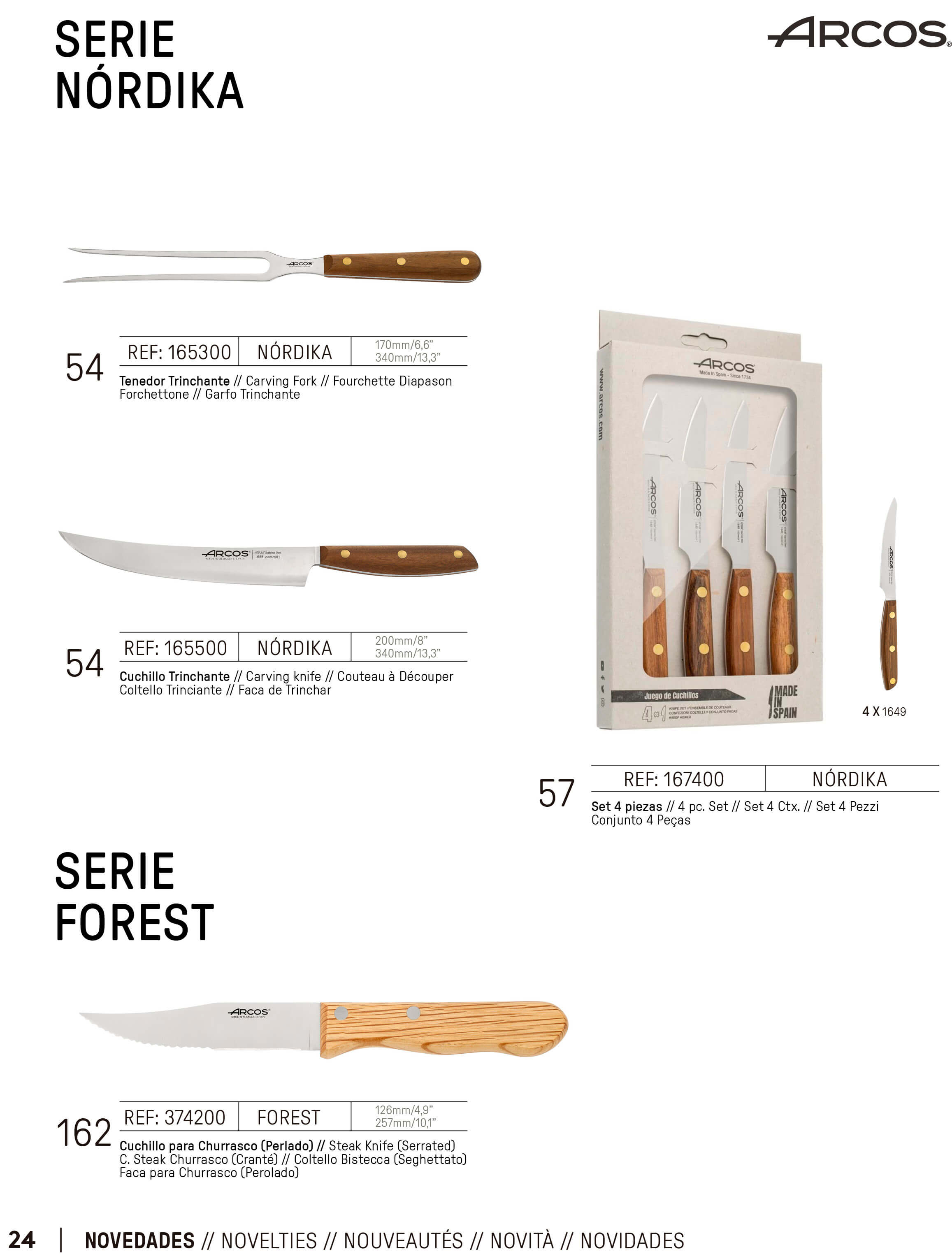 Colección de cuchillos y tenedor trinchante de cocina serie Nórdika. Los cuchillos de esta colección (para churrasco (perlado) y trinchante) van desde los 257 mm hasta los 340 mm. Además de tener un set de cuatro cuchillos trinchantes de cocina.
