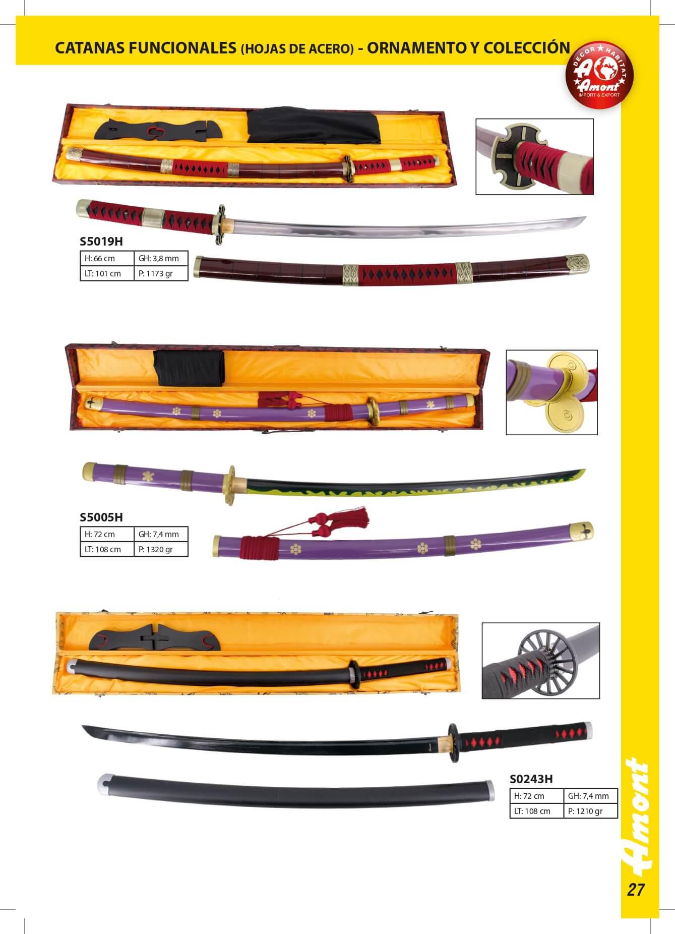 Katana con caja S5005H Katana Enma de Zoro de One Piece réplica no oficial acabada en lila, de 108 cm hoja de acero al carbono AISI 1045 acabada en negro con detalles en el corte amarillos y verdes, con vaina lila con detalles dorados y encordado rojo, mango lila con con detalles dorados, con caja de madera forrada de tejido decorativo de presentación