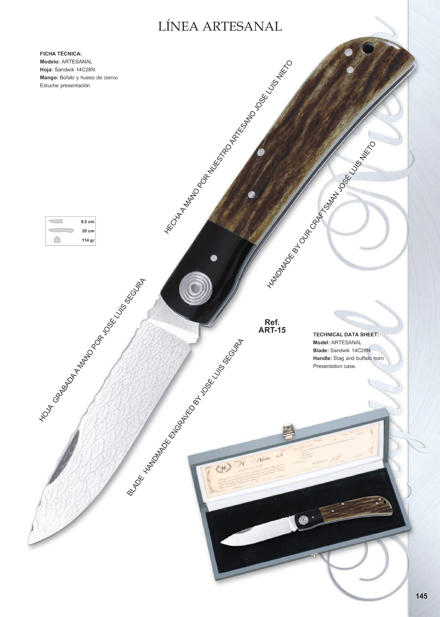 Linea Artesanal 15Hecha a mano, por el artesano Jose Luis Nieto.Hoja: acero Sandvik 14C28N.Longitud hoja 9,5 cm. Total 20 cm. Peso 114 gr.Presentación en estuche.Mango: Búfalo y hueso de ciervo.