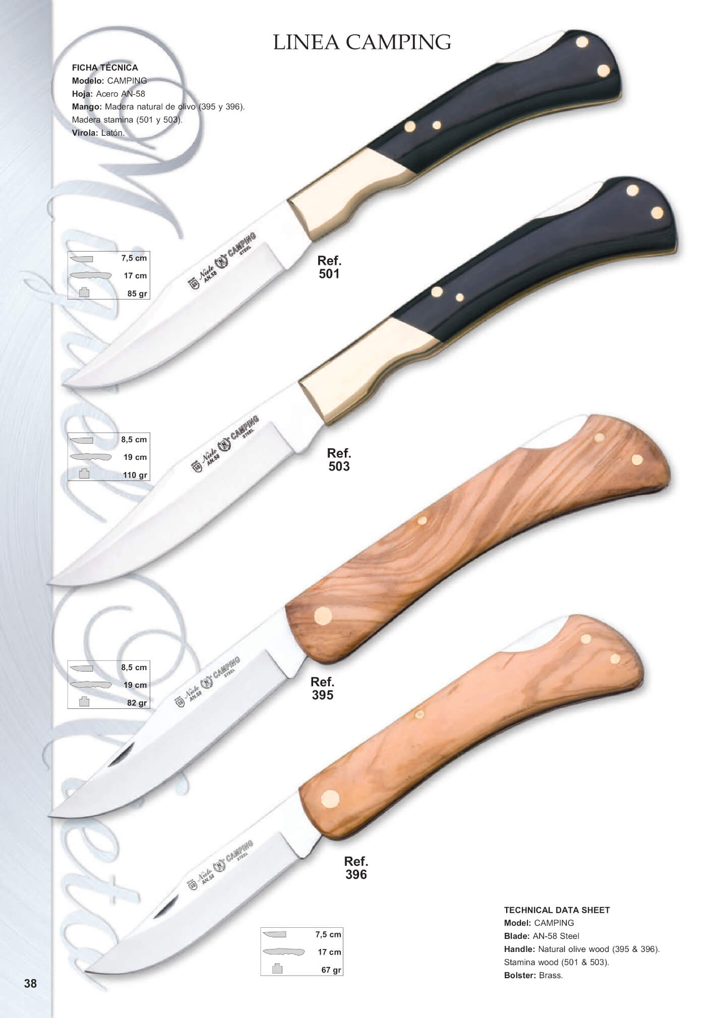 Hoja de acero AN58, mango de madera natural olivo o estamina con virola de latón.