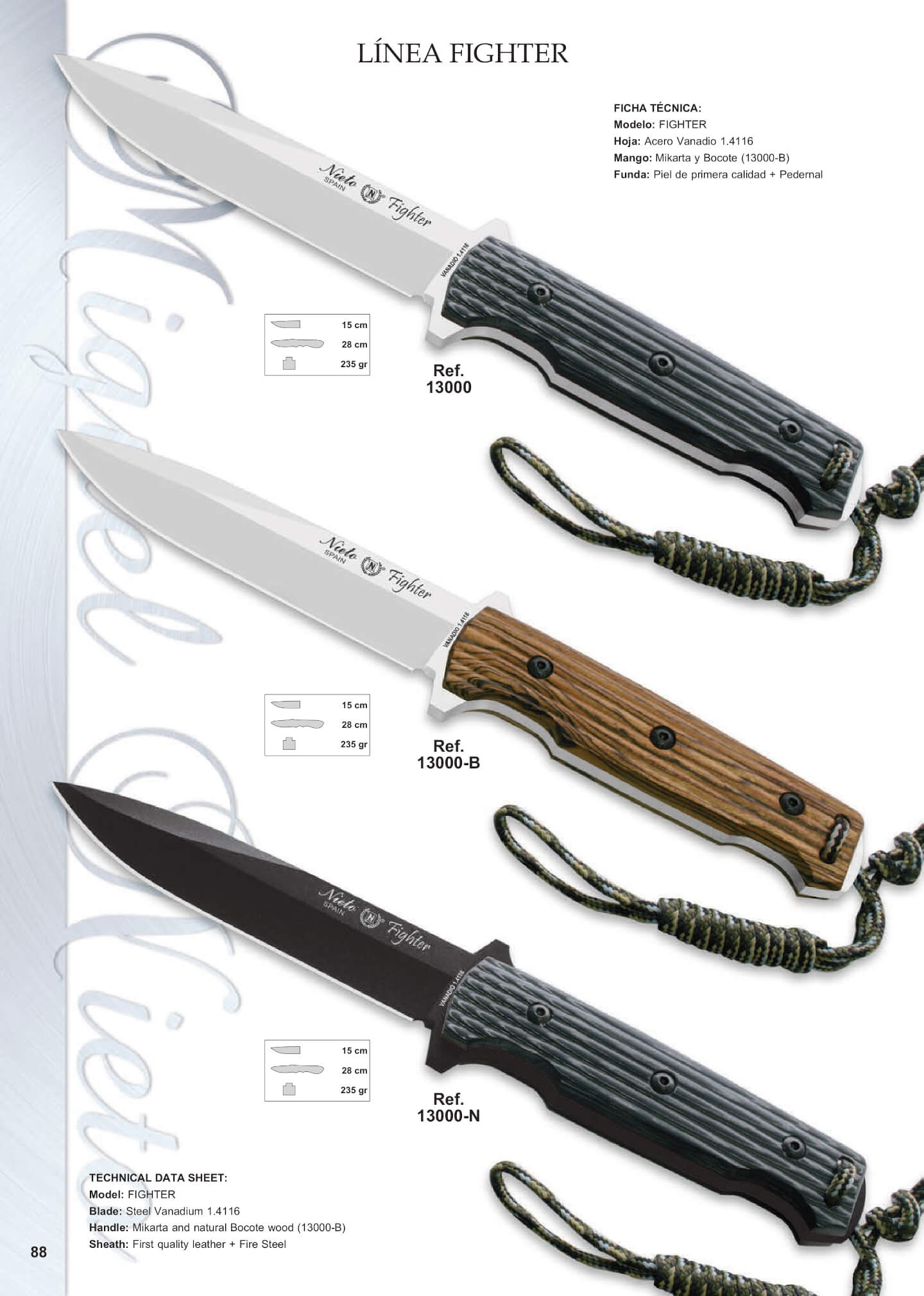 Cuchillos enterizos fabricados en acero Vanadio 1.4116 de 15 cm de hoja. Longitud total 28 cm. Incluye funda de piel de primera calidad y pedernal. Peso: 235 gr.