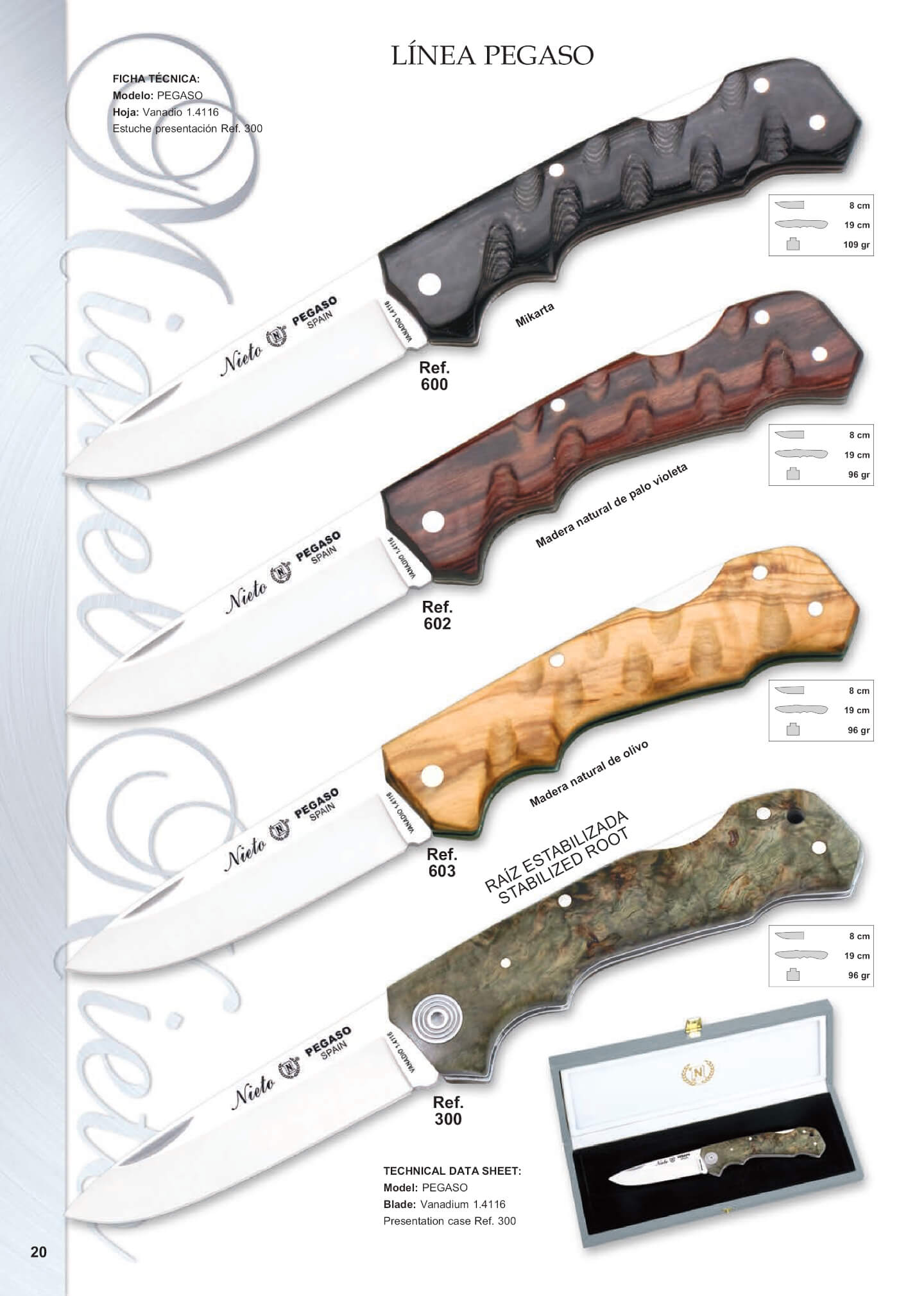 Navajas tacticas diseñadas por Manuel Nieto.Hoja de acero AN58.Longitud hoja de 8 cm. Total abierta 19 cm.600 Mango de Mikarta negra. Peso 109 gr.602 Mango de madera natural palo violeta. Peso 96 gr.603 Mango de madera natural olivo. Peso 96 gr.