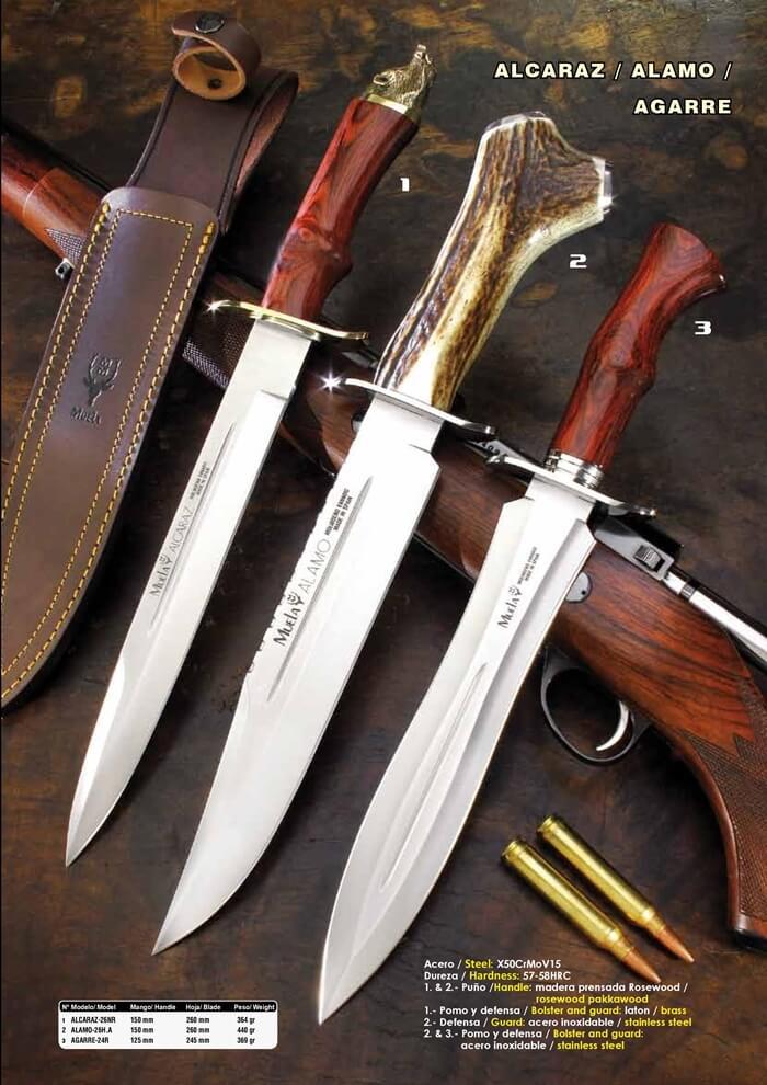 Cuchillos de caza Alcazar, Alamo y Agarre, fabricados con acero X50CrMoV15 y puño de madera prensada rosewood o asta de ciervo.