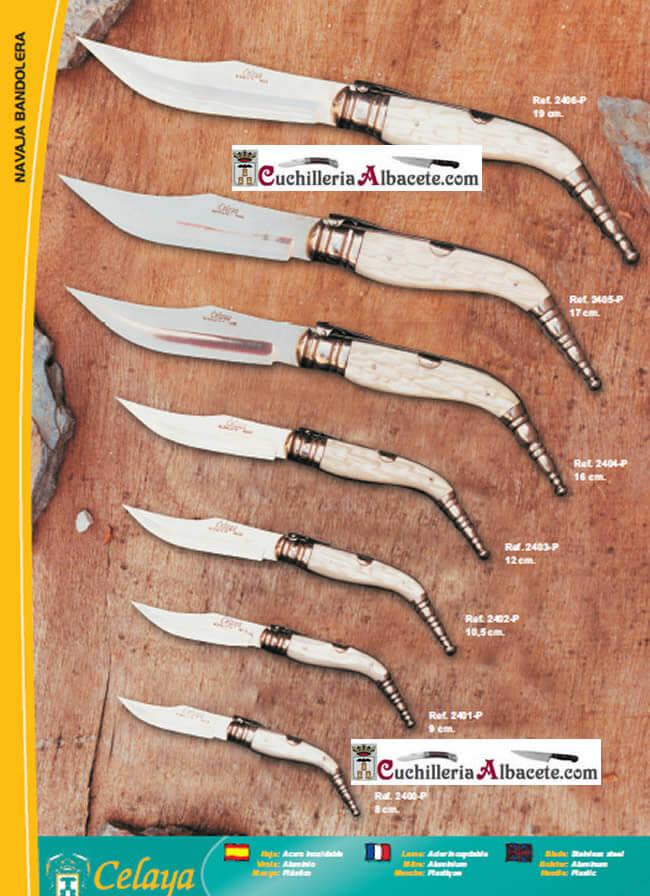 Navajas bandoleras con hoja de acero acero inoxidable. Mango en madera de plástico imitación al nácar y virola de aluminio.