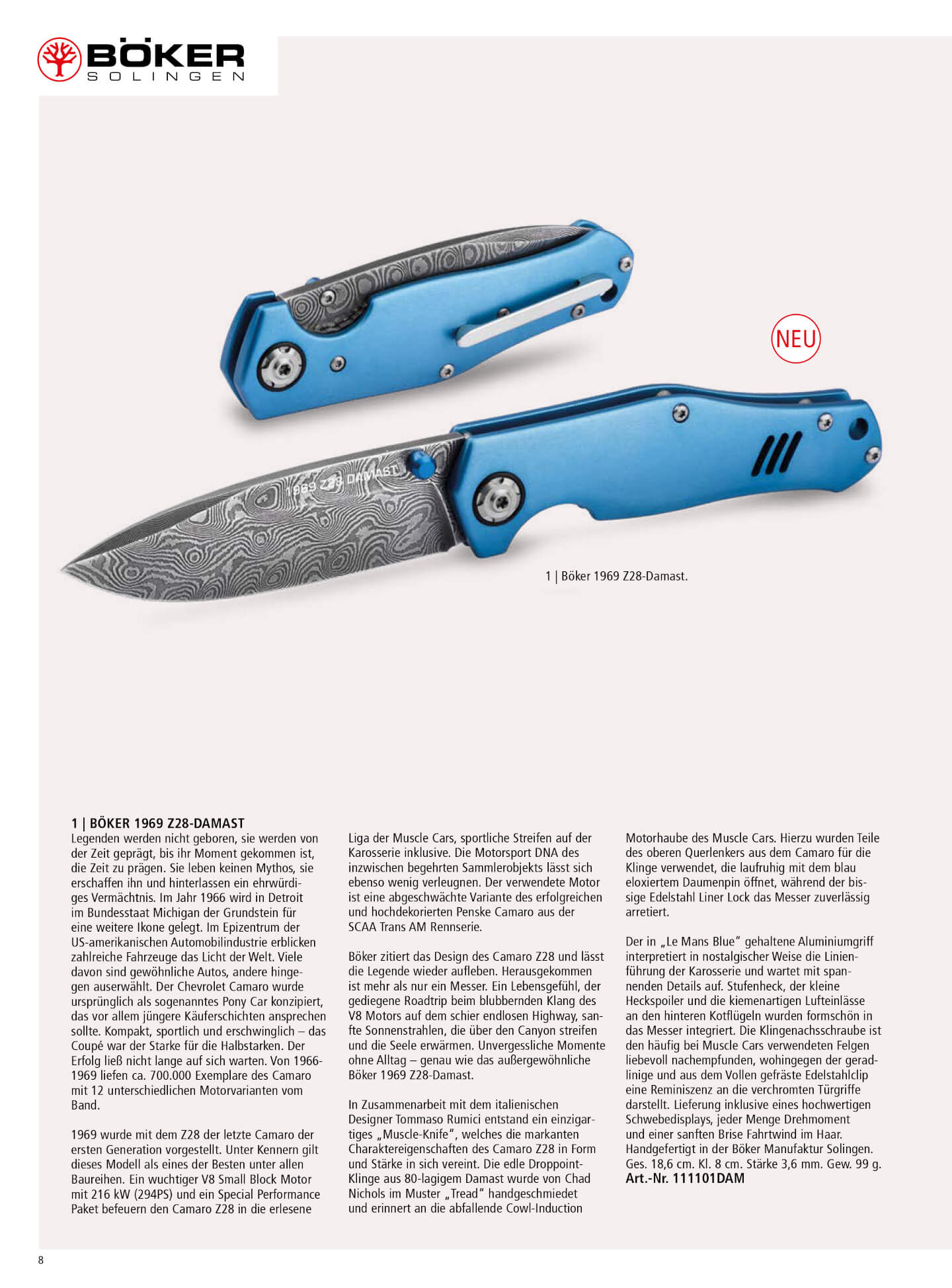 La navaja de damasco Boker 1969 Z28 damast, es una versión de coleccionista impactante inspirada en el famoso Chevrolet Camaro.
