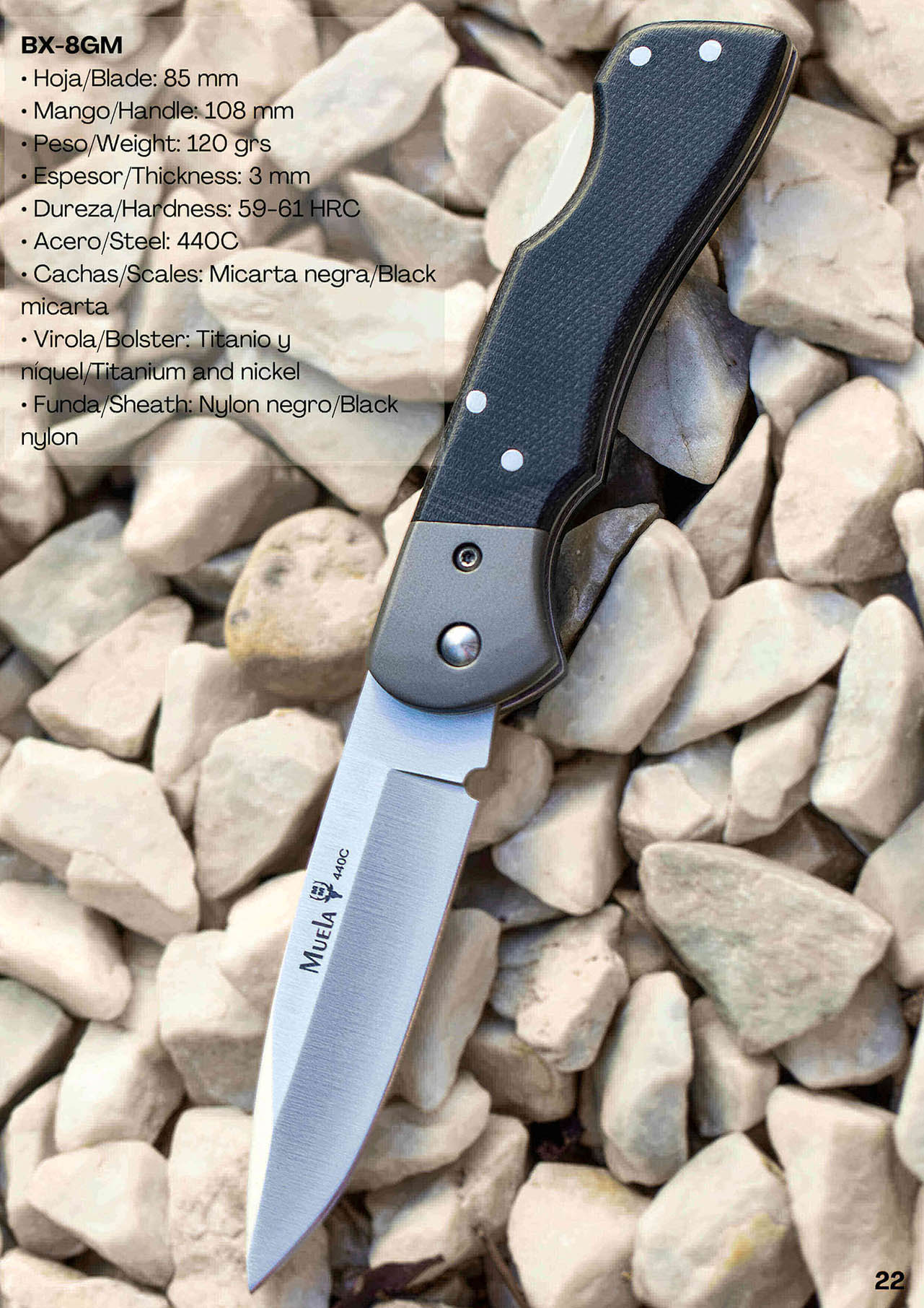 Navaja de bolsillo Muela BX-8GM.Una navaja ligera, con hoja de acero inoxidable de 8 cm y bloqueo lockback. Su mango de micarta negra es resistente y elegante.Incluye funda de nylon negro.
