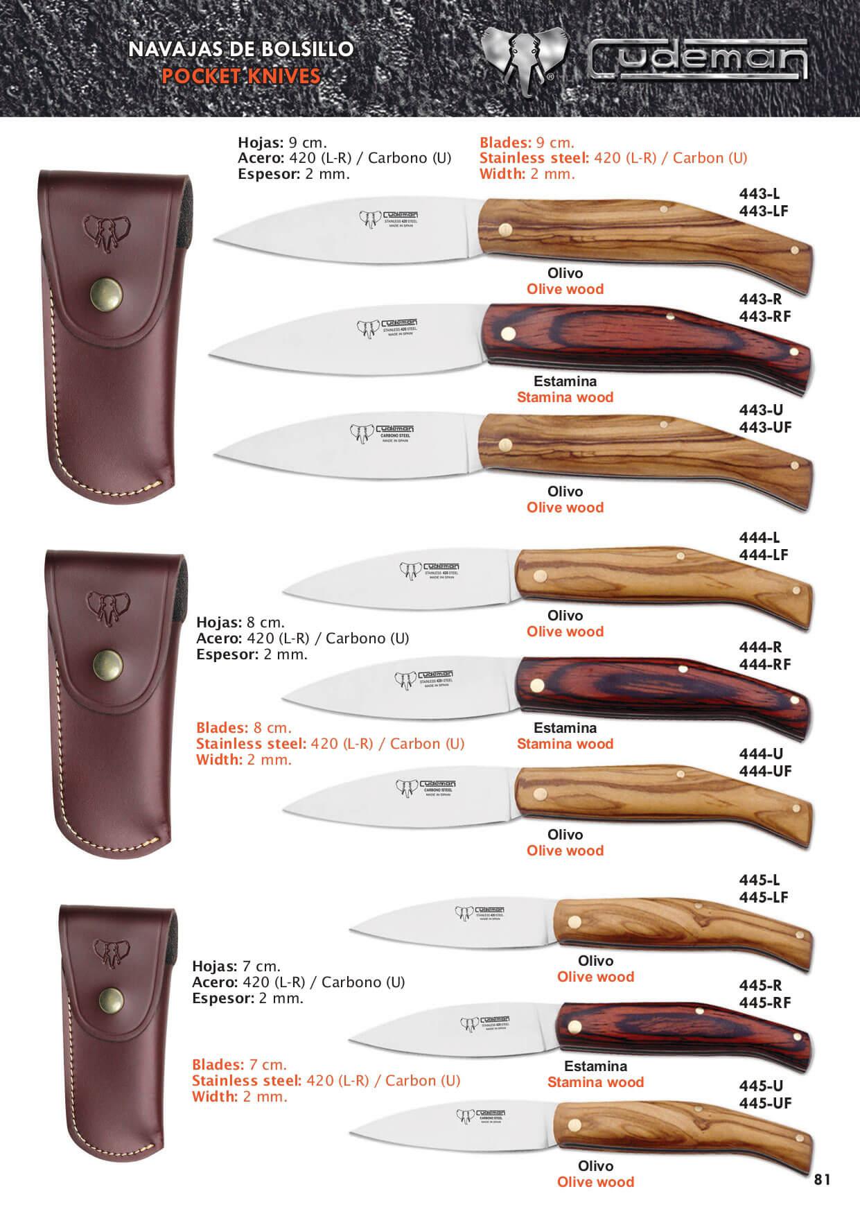 Navajas camperas en olivo, asta de toro o stamina.
