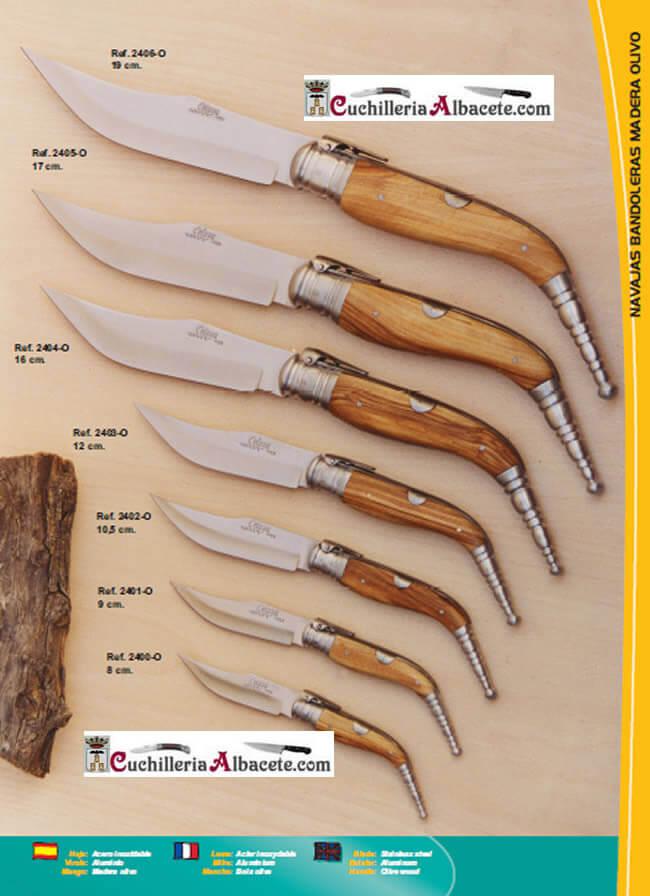 Navaja bandolera con hoja de acero inox. Virola de aluminio. Mango de madera de olivo.