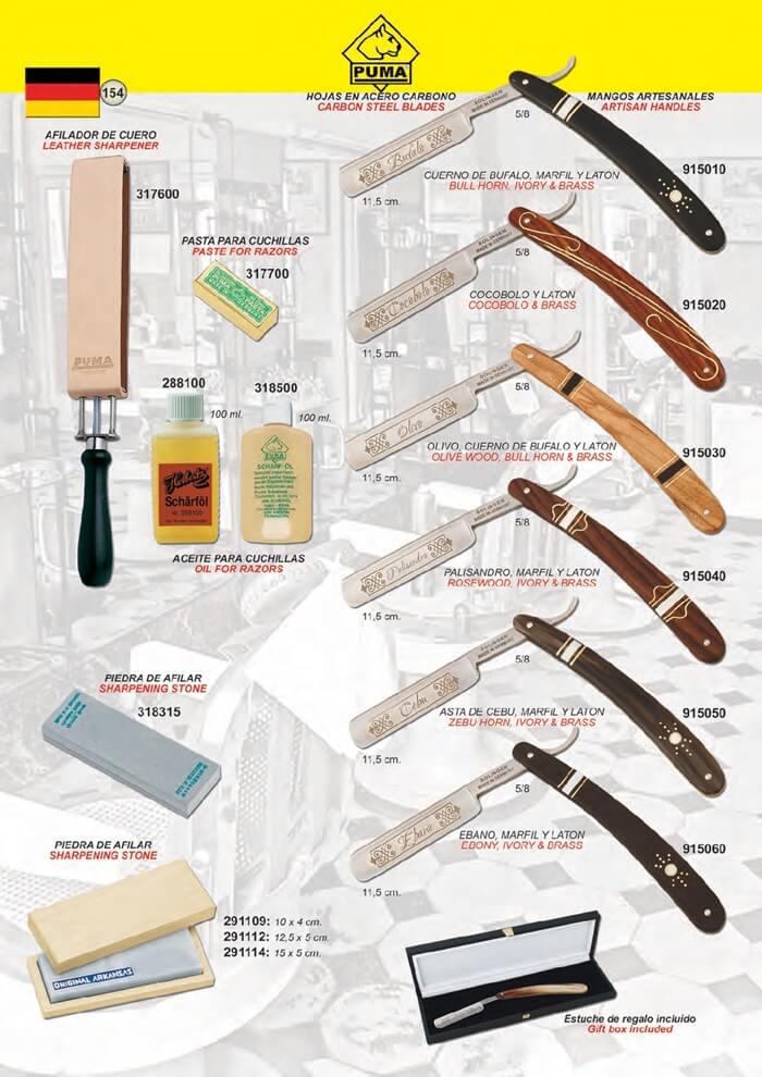 Navajas de afeitar, piedras de afilar, asentadores y aceite para cuchillas de afeitar.