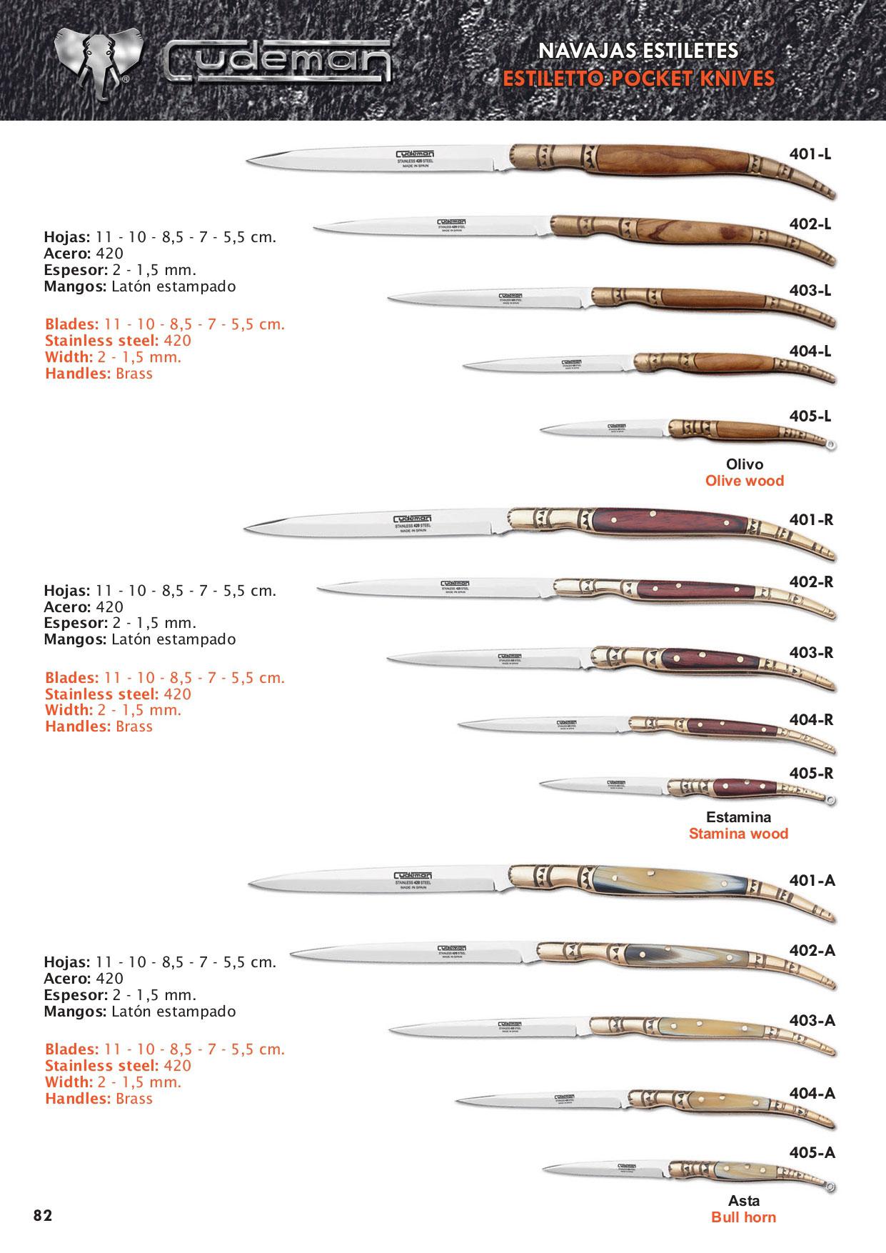 Navajas estiletes con hoja de acero 420. Virola de latón estampado. Mangos en madera de olivo, estamina roja o asta de toro. Cierre de pistón.