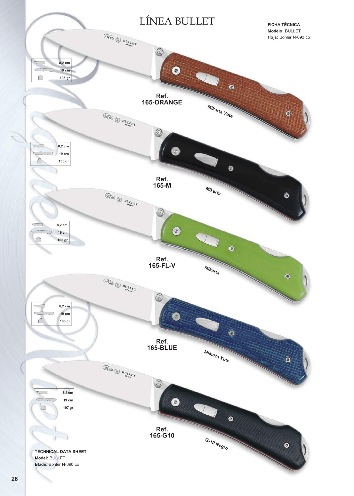 Navajas de bolsillo Nieto línea Bullet con hoja de acero Böhler N690 Co de 8,2 cm. La hoja tiene un tetón para facilitar la apertura con una sola mano. Con bloqueo de botón trasero y agujero para cordón fiador. Las cachas tienen una bala incrustada.