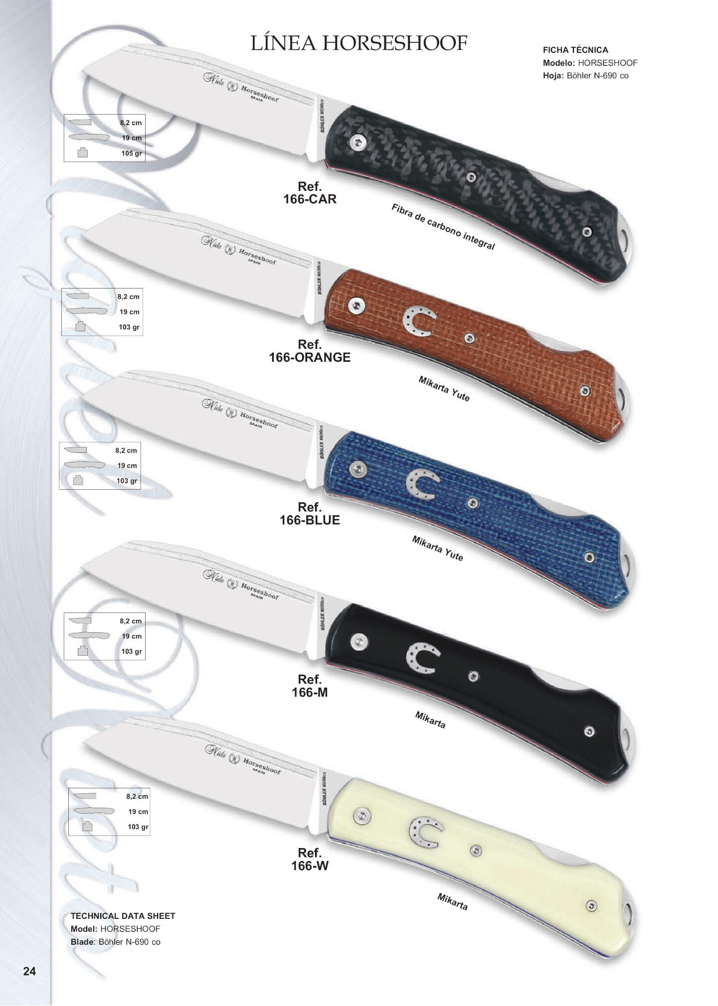 Navajas de bolsillo Nieto línea Horseshoof con hoja de acero Böhler N690 Co de 8,2 cm. Con bloqueo de botón trasero y agujero para cordón fiador. Las cachas tienen una herradura incrustada.