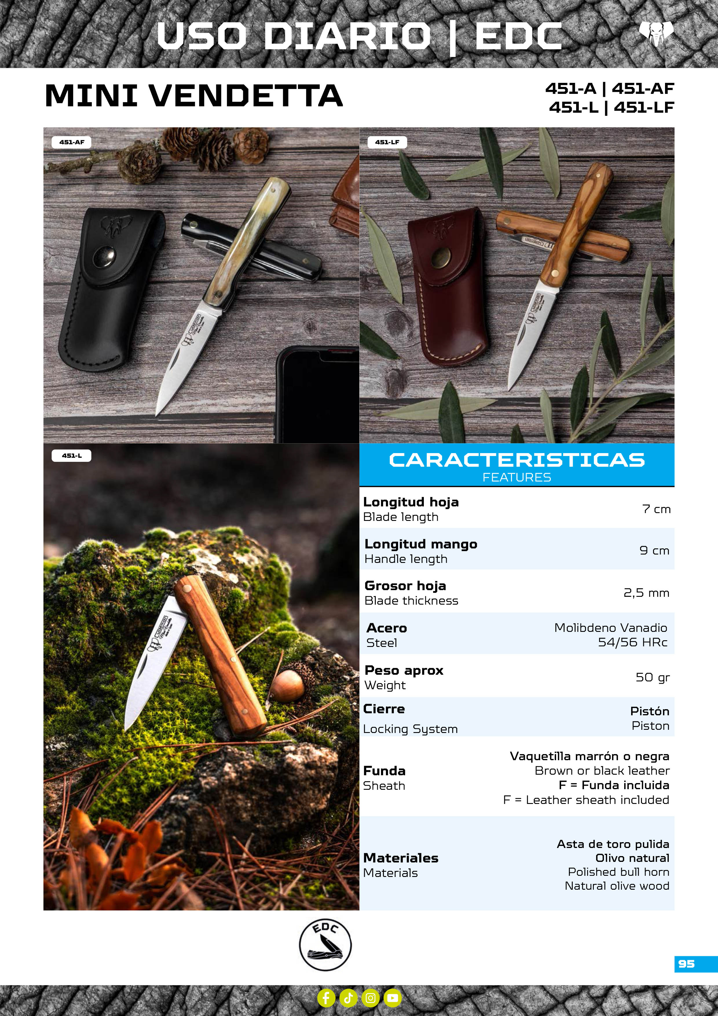 Navajas de acero Molibdeno Vanadio con 7 cm de hoja. Longitud total: 16 cm. Espesor:2,5 mm. Ancho de pala: 1,5 cm. Cierre de pistón. Virolas de acero A-304. Mangos de madera de cocobolo, olivo o asta de toro.