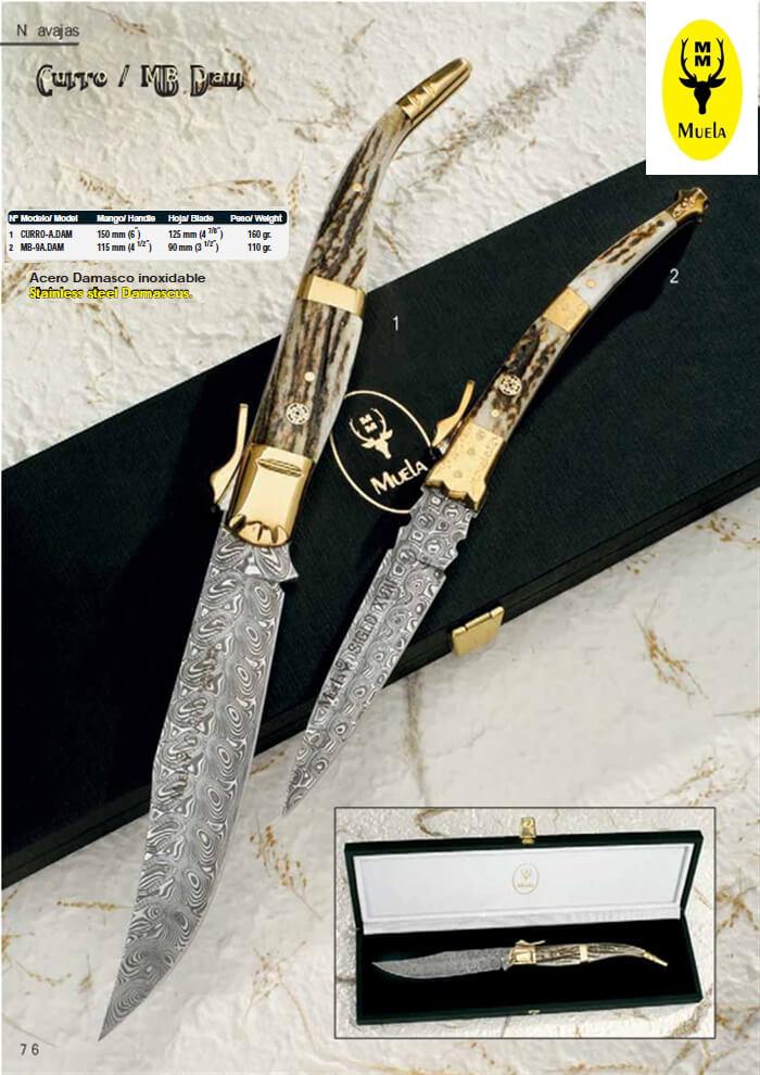 Navajas de colección, acero damasco, asta de ciervo y latón