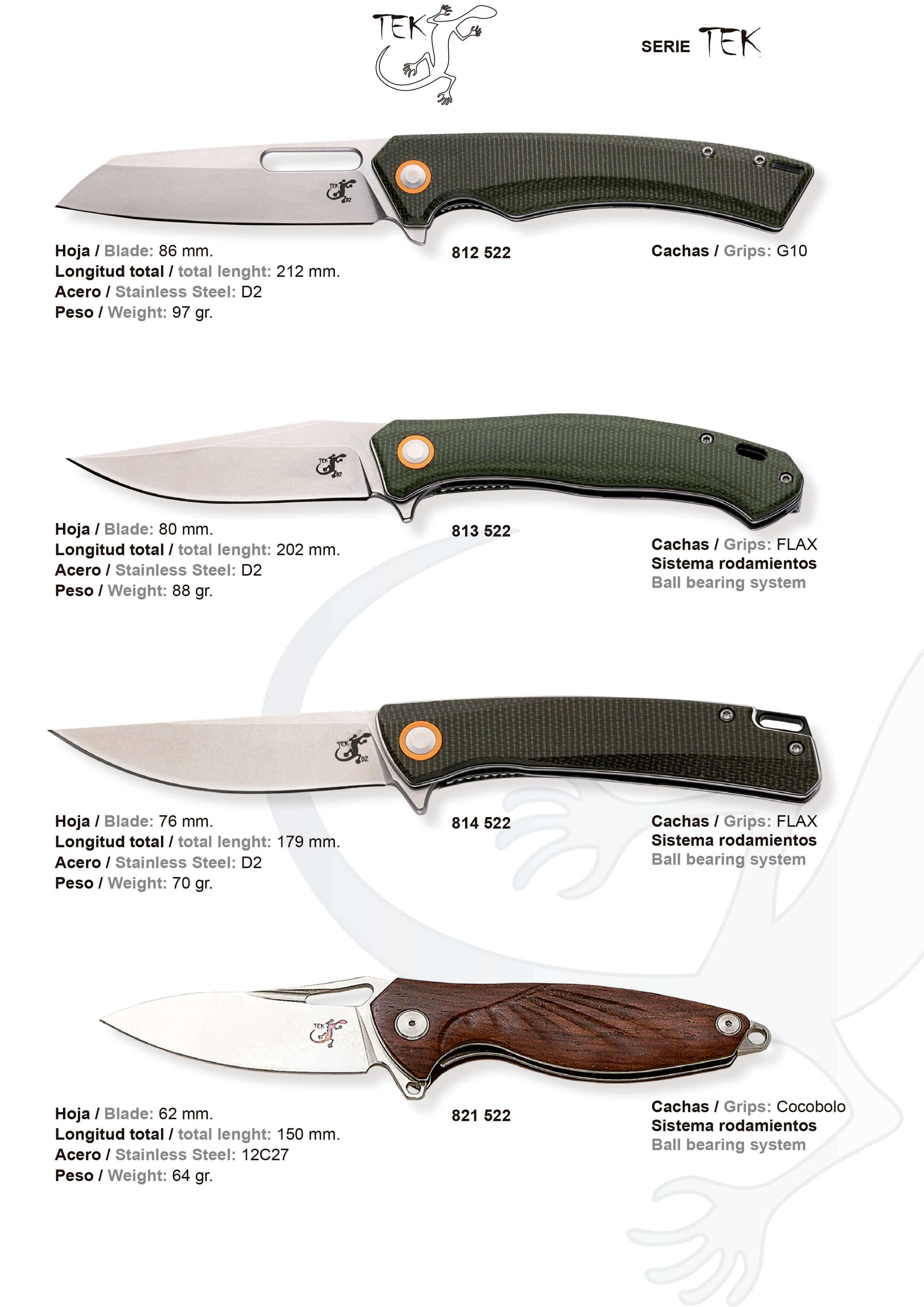 Compuesta de cinco navajas tácticas, dos de ellas con acero VG-10 67 Capas y las otras tres con acero Cocobolo. Además, la última navaja de esta colección tiene incluida una funda para poder guardar dicha navaja.