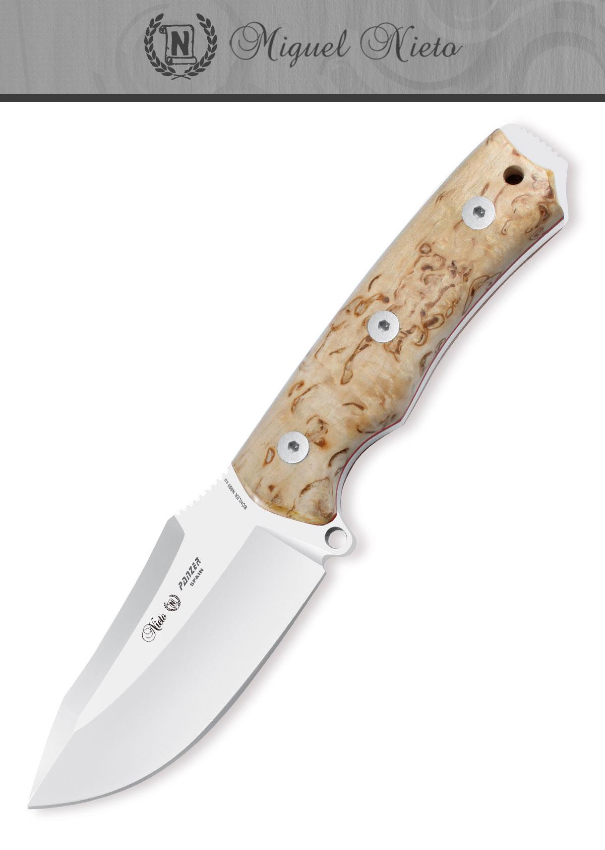 Cuchillo enterizo con puño de madera de abedul. Hoja de acero Böhler N690Co con alto contenido en cromo y carbono. Este cuchillo de acero inoxidable tiene una hoja de 9,5 cm de largo y punta drop point. Grosor de hoja 5,3 mm.