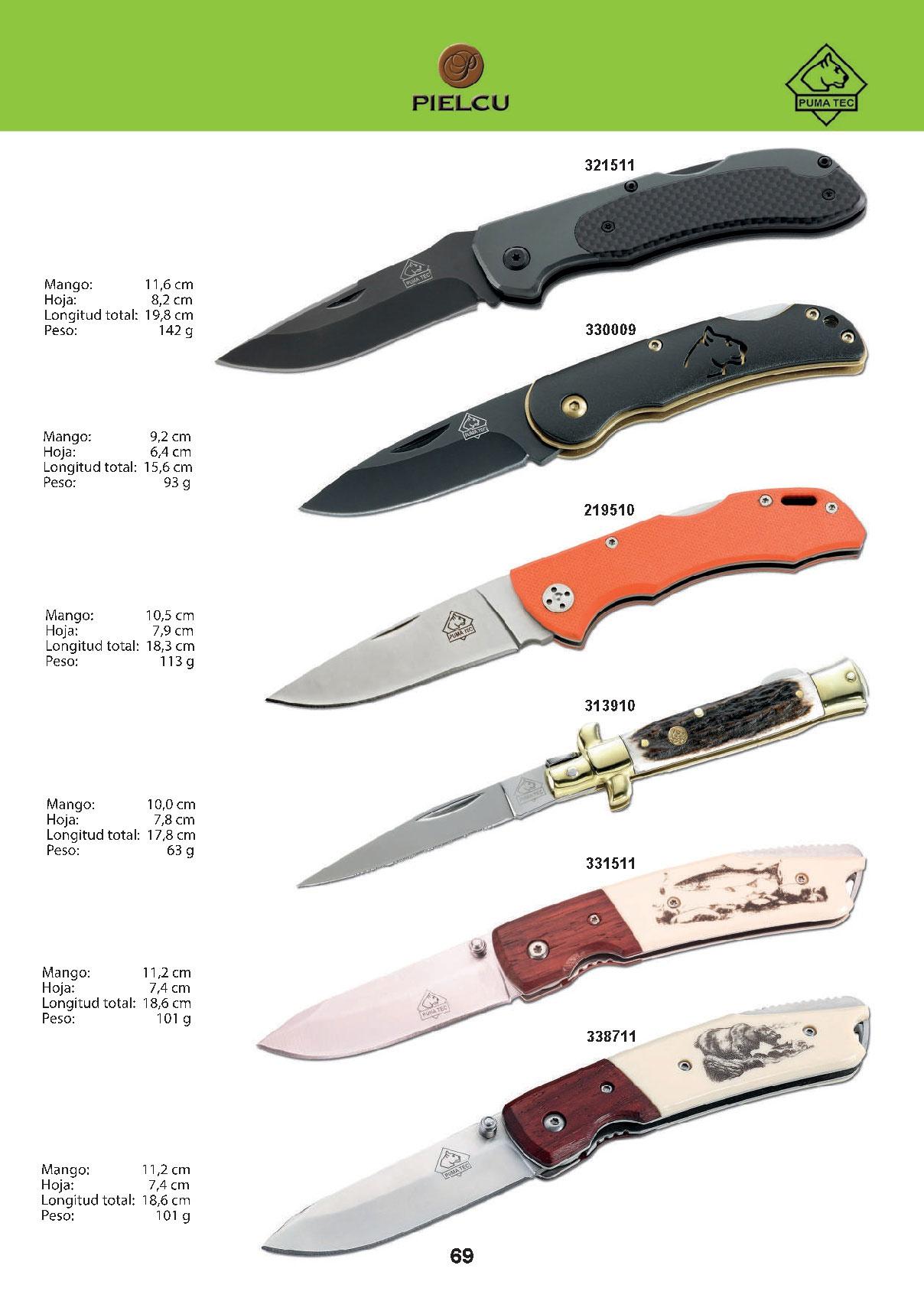 Navajas de Puma Tec para la caza y de campo con mango de madera de cebra, sándalo, ébano u olivo y hoja de acero AISI 420.
