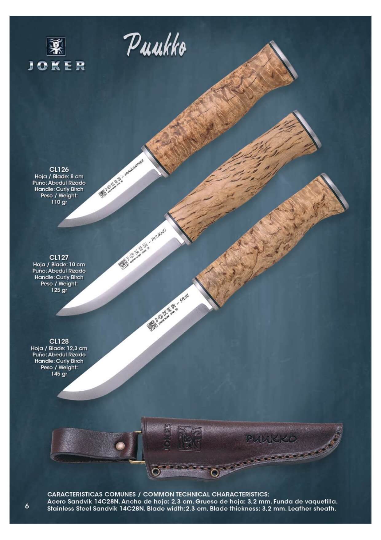 Cuchillos de la serie Puukko de Joker con hoja de acero Sandvik 14C28N de 3.2 mm de grosor y funda de vaquetilla