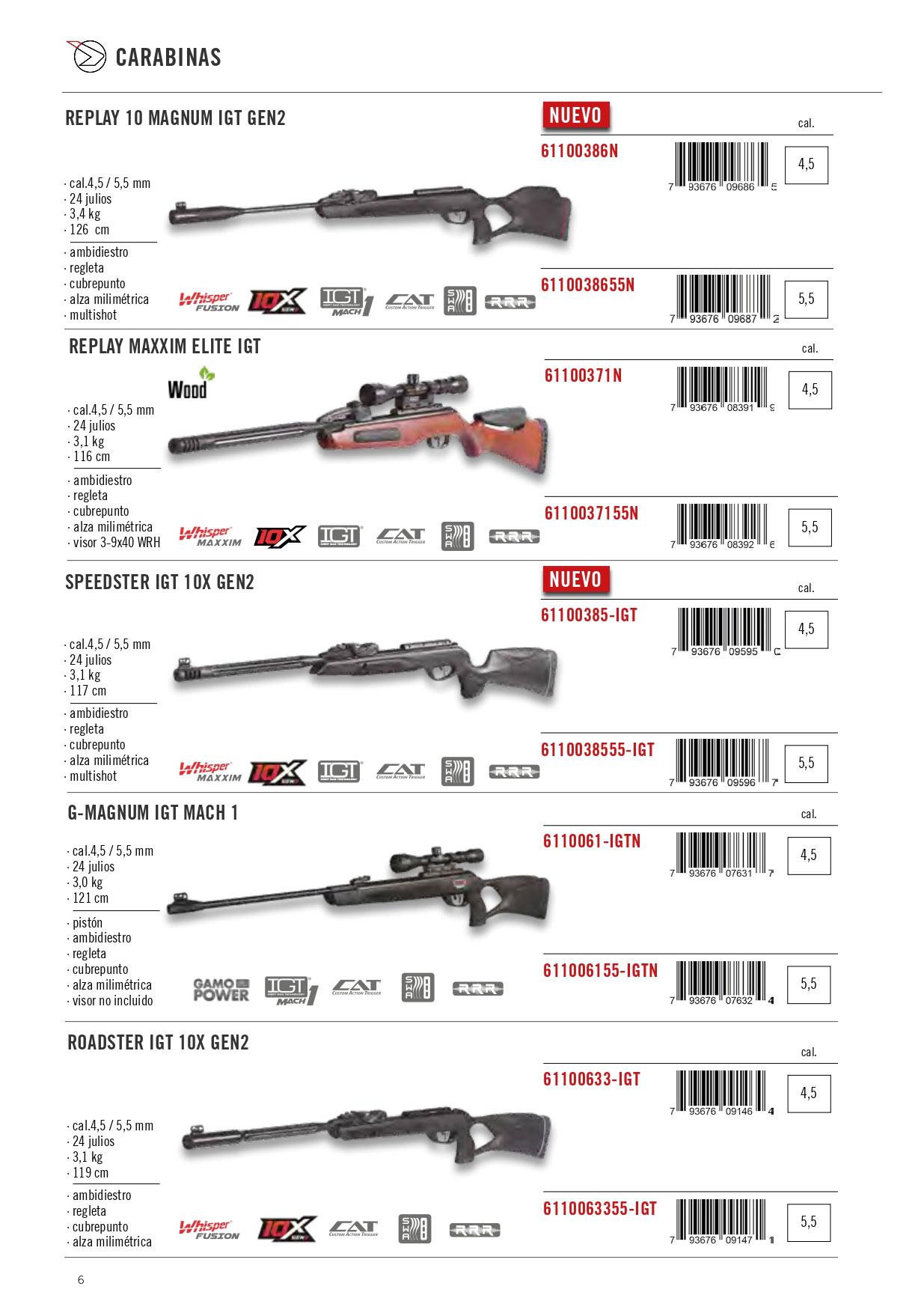 Carabinas ambidiestras con regleta reductora del retroceso, cubrepunto y alza milimétrica. Culata con absorción del retroceso (SWA) y gatillo de 2 tiempos (CAT) Replay 10 Magnum IGT Gen2 Cal. 4.5 y 5.5 mm. Con moderador de sonido Whisper fusion. Cargador horizontal de 10 disparos (10X GEN2). Cámara de 33 mm. Mayor velocidad, impacto y precisión. Replay Maxxim Elite IGT Cal. 4.5 y 5.5 mm. Culata de madera de haya con inserciones de goma. Sistema neumático de carga IGT. Realice 10 disparos sin tocar un balín; Incluye 2 cargadores. Cañón con sistema Whisper Maxxim de reducción de sonido. Visor 3-9X40WR con monturas altas incluido (1PMHM). Carrilera regulable en altura para perfecto acople. Speedster IGT 10X Gen 2 Cal. 4.5 y 5.5 mm. Con moderador de sonido Whisper maxxim. Cargador horizontal de 10 disparos (10X GEN2). Mayor precisión. G-Magnum IGT Mach 1 Carabina con sistema Gamo Power, cilindro de 33 mm. Pistón. Roadster IGT 10X Gen 2 Cal. 4.5 y 5.5 mm. Con moderador de sonido Whisper fusion. Cargador horizontal de 10 disparos (10X GEN2).