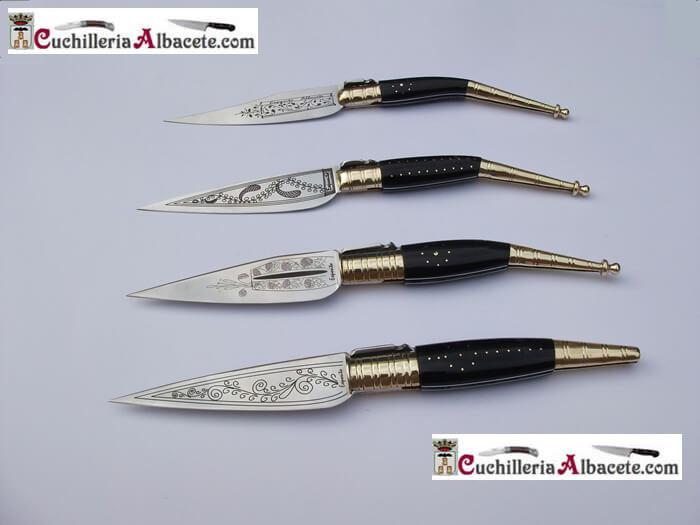 Navajas sevillanas y albaceteña de reproduccion, Hoja de acero 440 grabada, virola y rebajo en laton