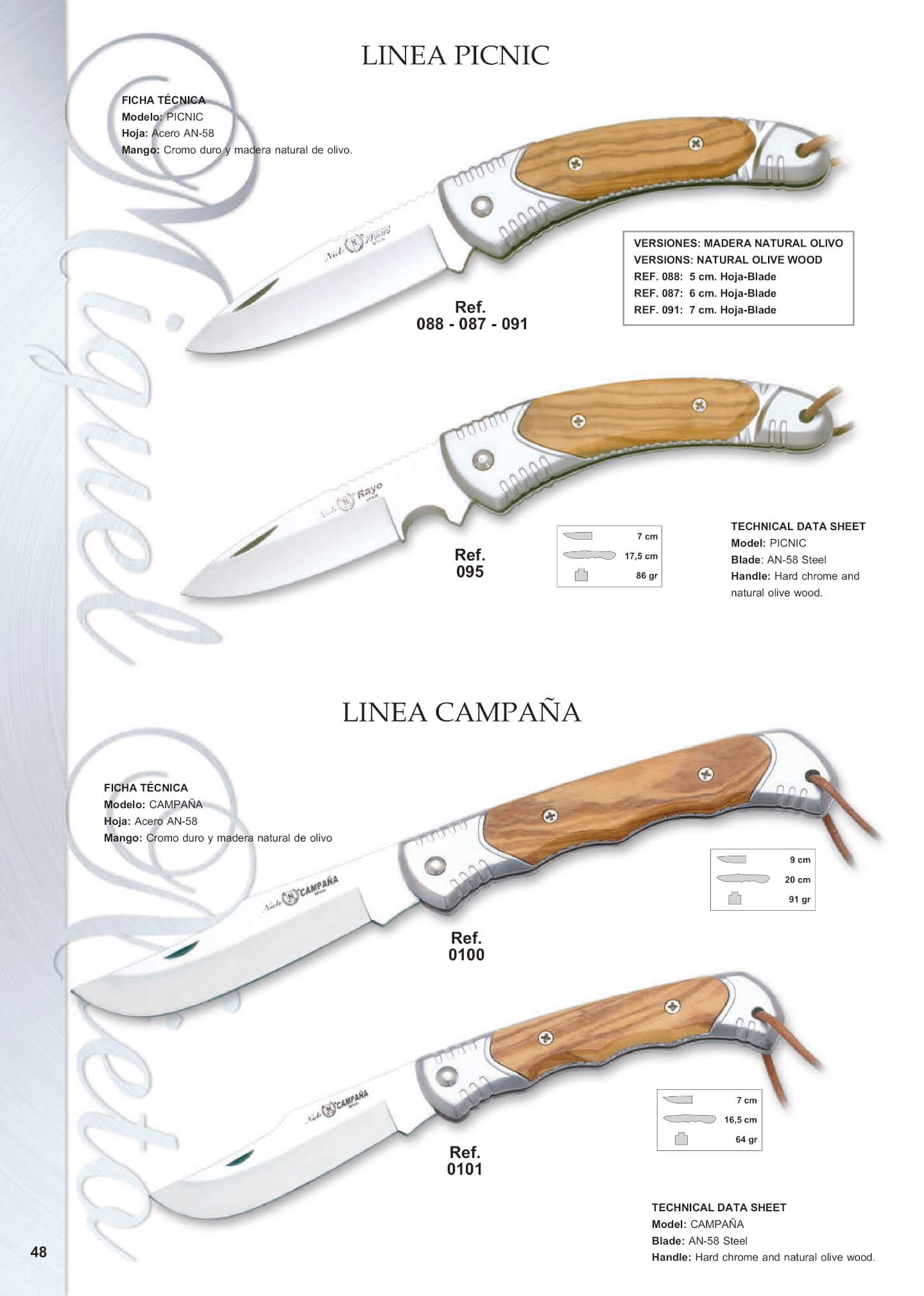 Hoja de acero AN58. Mango de cromo duro y madera natural de olivo.