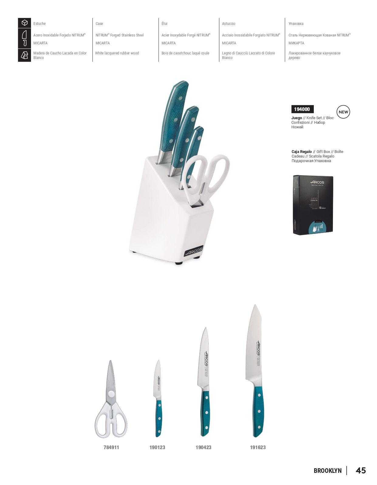 Hojas de acero forjado NITRUM y mangos de micarta aguamarina. Taco de madera de caucho lacado en color blanco. Incluye: Rocking santoku de 19 cm de hoja, Cuchillo cocinero de 15 cm de hoja, cuchillo mondador de 10 cm de hoja y tijeras de cocina de 19,5 cm con mango de polipropileno blanco.