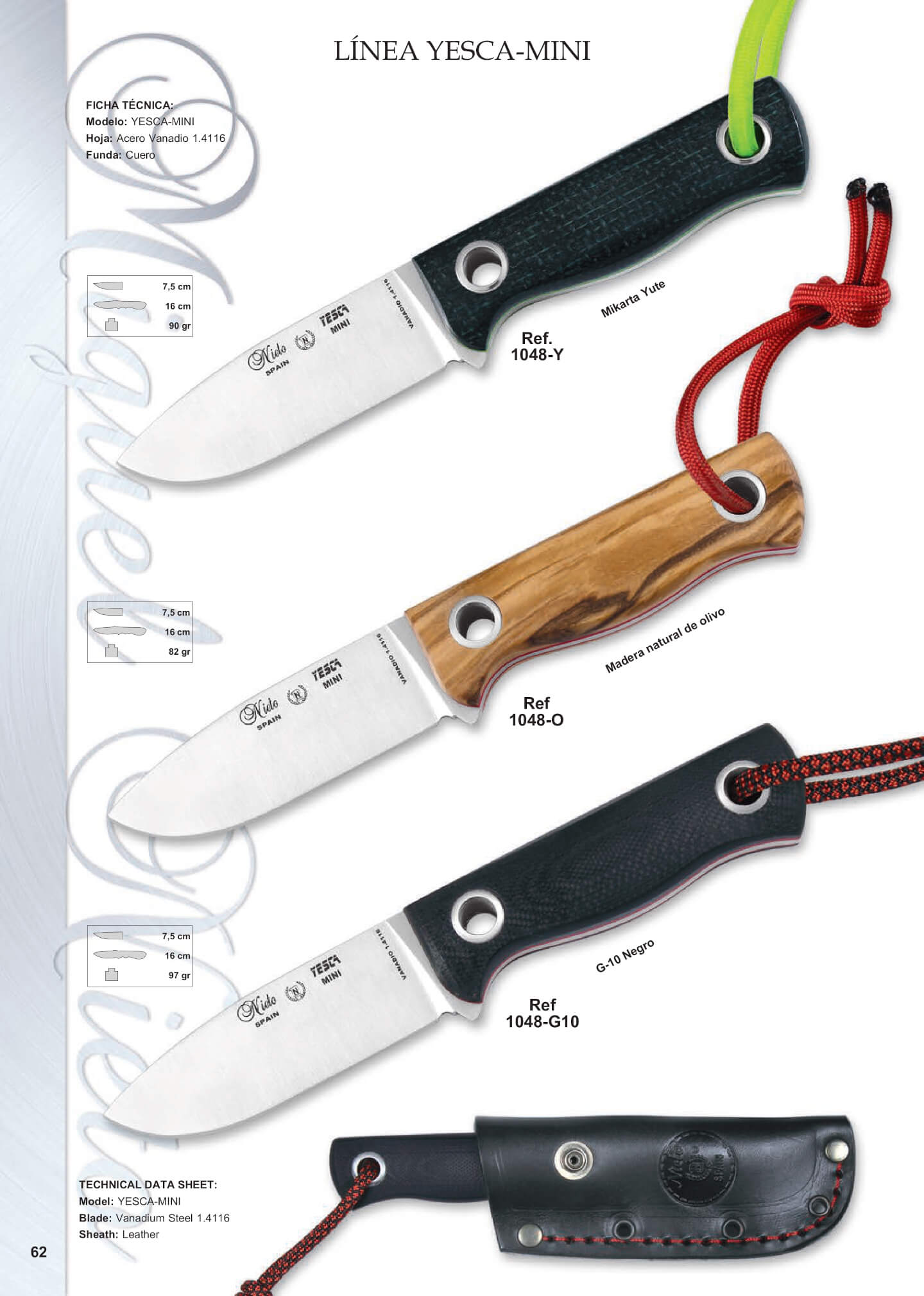 Cuchillos de la serie Yesca Mini de Nieto con hoja de acero 1.4116 de 7.5 cm de largo, 3 mm de espesor, 16 cm de longitud total y peso de 91 gramos.
