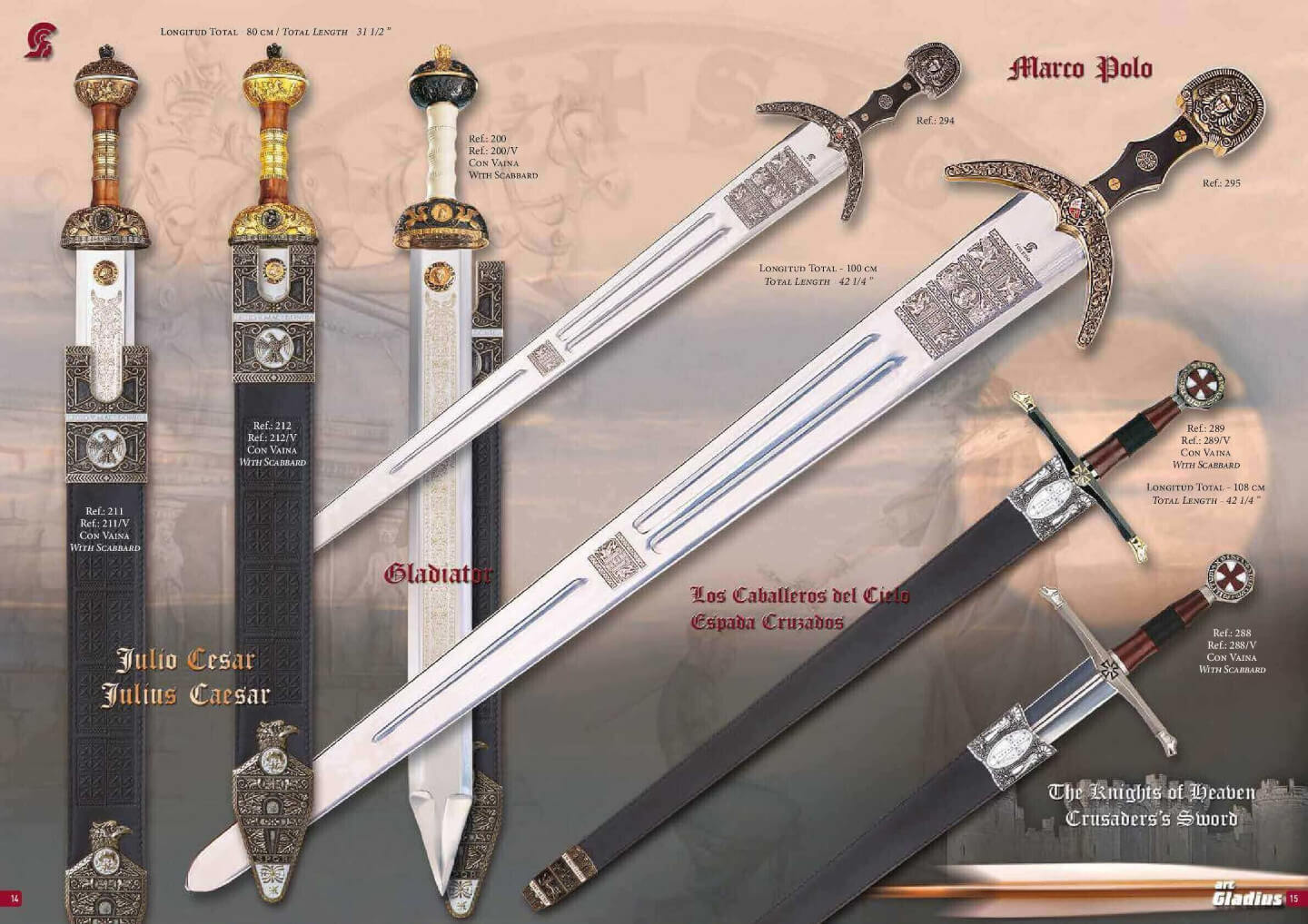 200 Gladiator Sword. 211 Julio Cesar Sword, bronze. 212 Julio Cesar Sword, gold.288 Cruzados Sword. Knights of the Sky. 289 Cruzados Sword. Knights of the Sky. 294 Marco Polo Sword. 295 Marco Polo Sword.