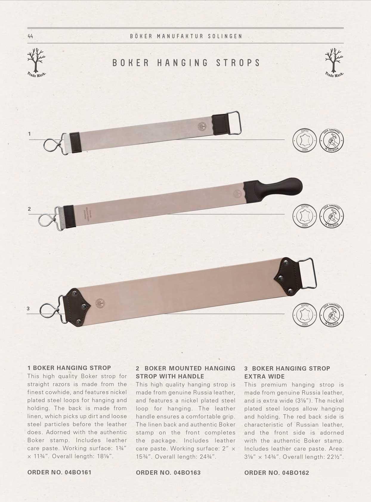 High-quality hanging strap made of real russian leather with a nickel-plated steel eyelet for hanging. The leather handle ensures a comfortable grip. Including linen back and authentic Boker embossing on the front. Delivery including leather care paste. Working surface: 5.0 x 40 cm. Overall length: 63 cm.