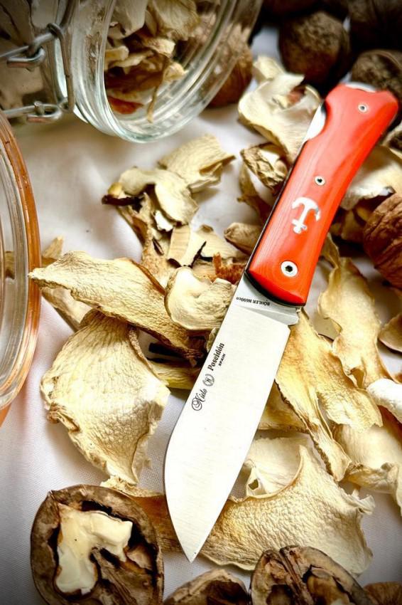 A sailor style knife with orange micarta handles and black spacers. Böhler N690Co steel blade with back button lock.
