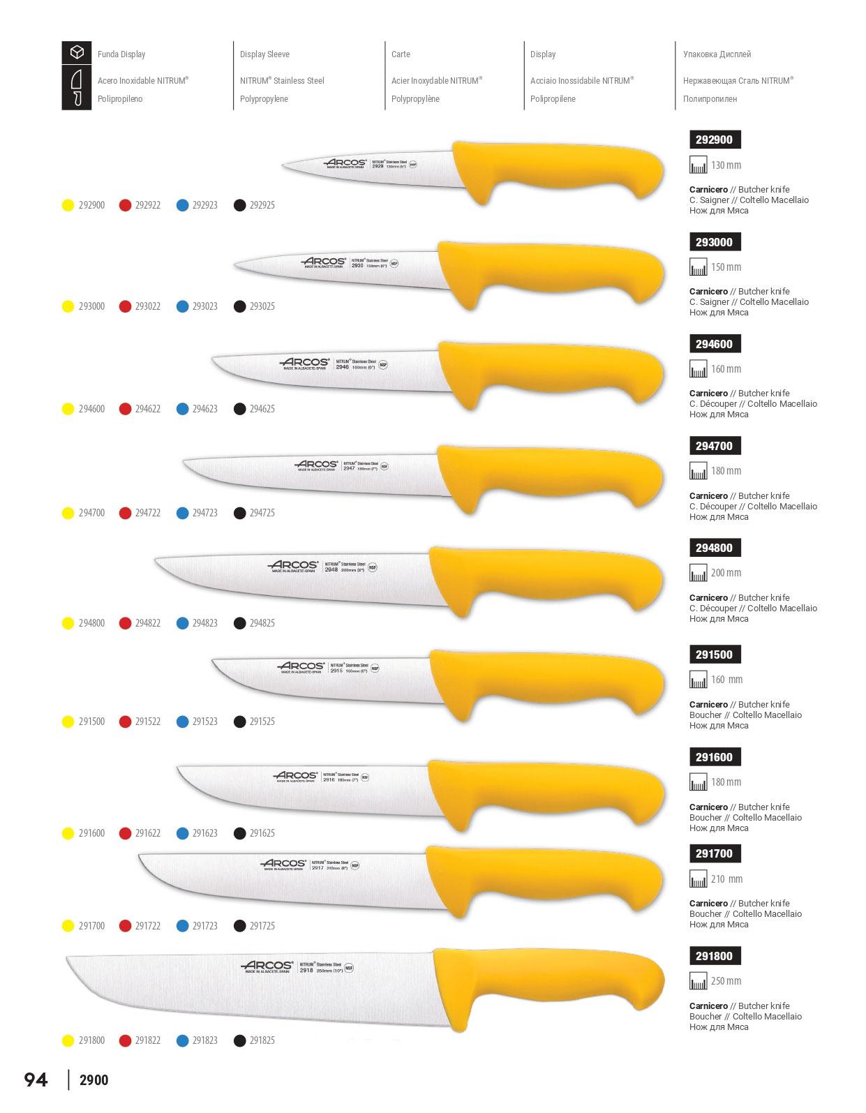 Butcher knives with resistant NITRUM stainless steel blades. A series designed for industry professionals, economic knives, handy, with a variety of colors for better organization. The Arcos 2900 series presents a wide variety of knives designed for kitchen, butchery, pastry, fishmongery...