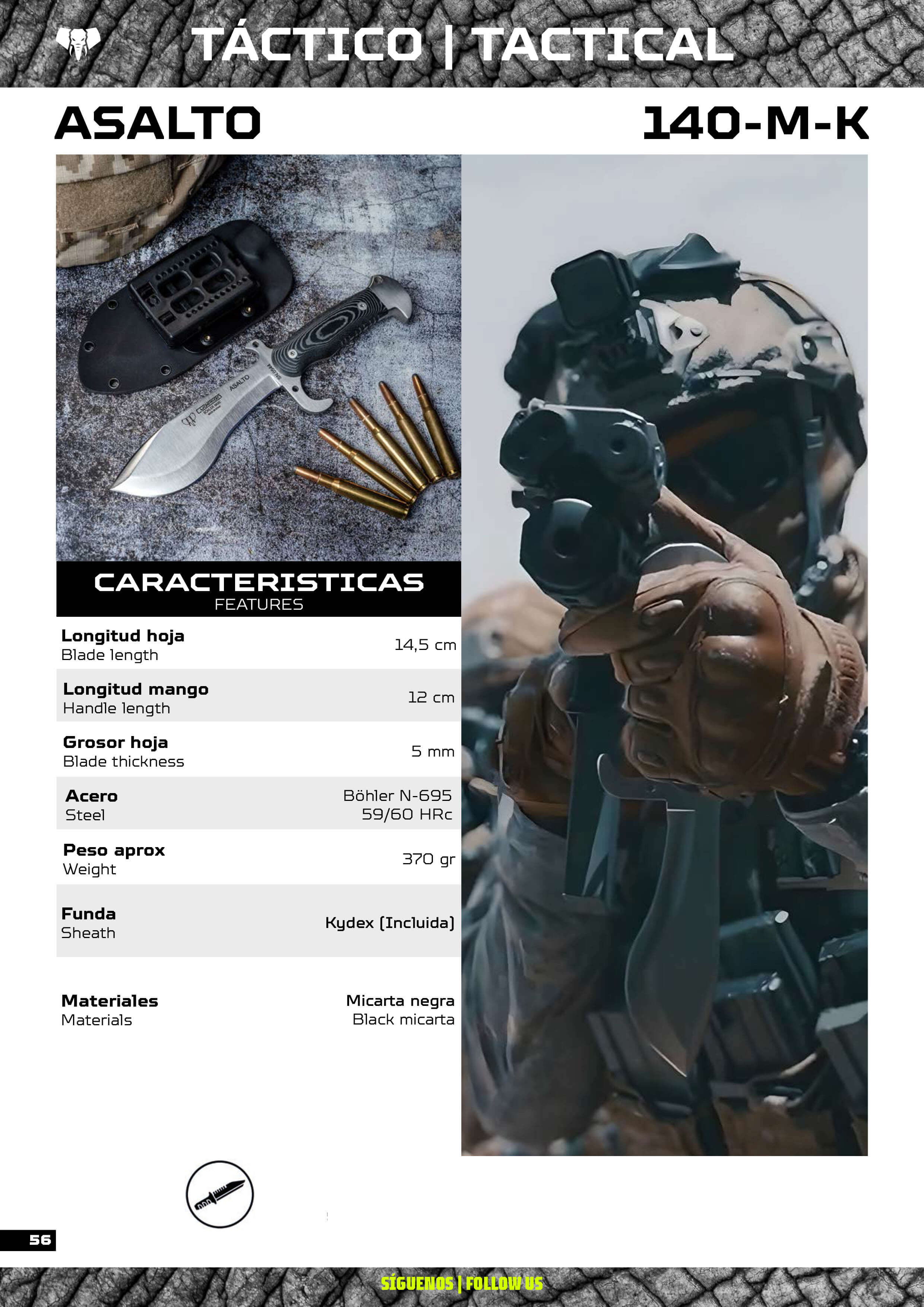 Full tactical knife with mikarta handles, Böhler N695 steel blade and Kydex sheath.
