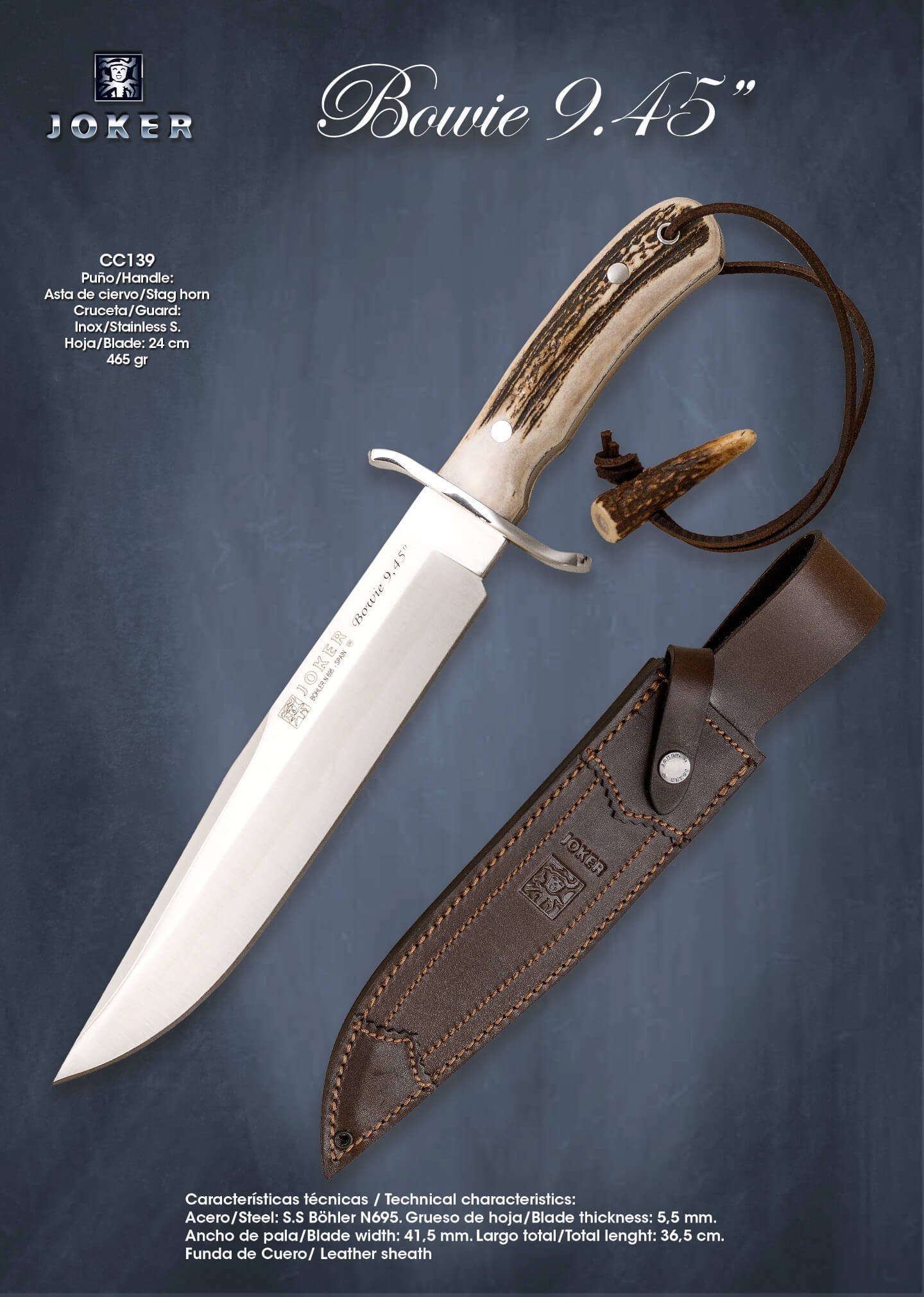 Couteau de chasse Joker Bowie 9.45 avec manche en bois de cerf