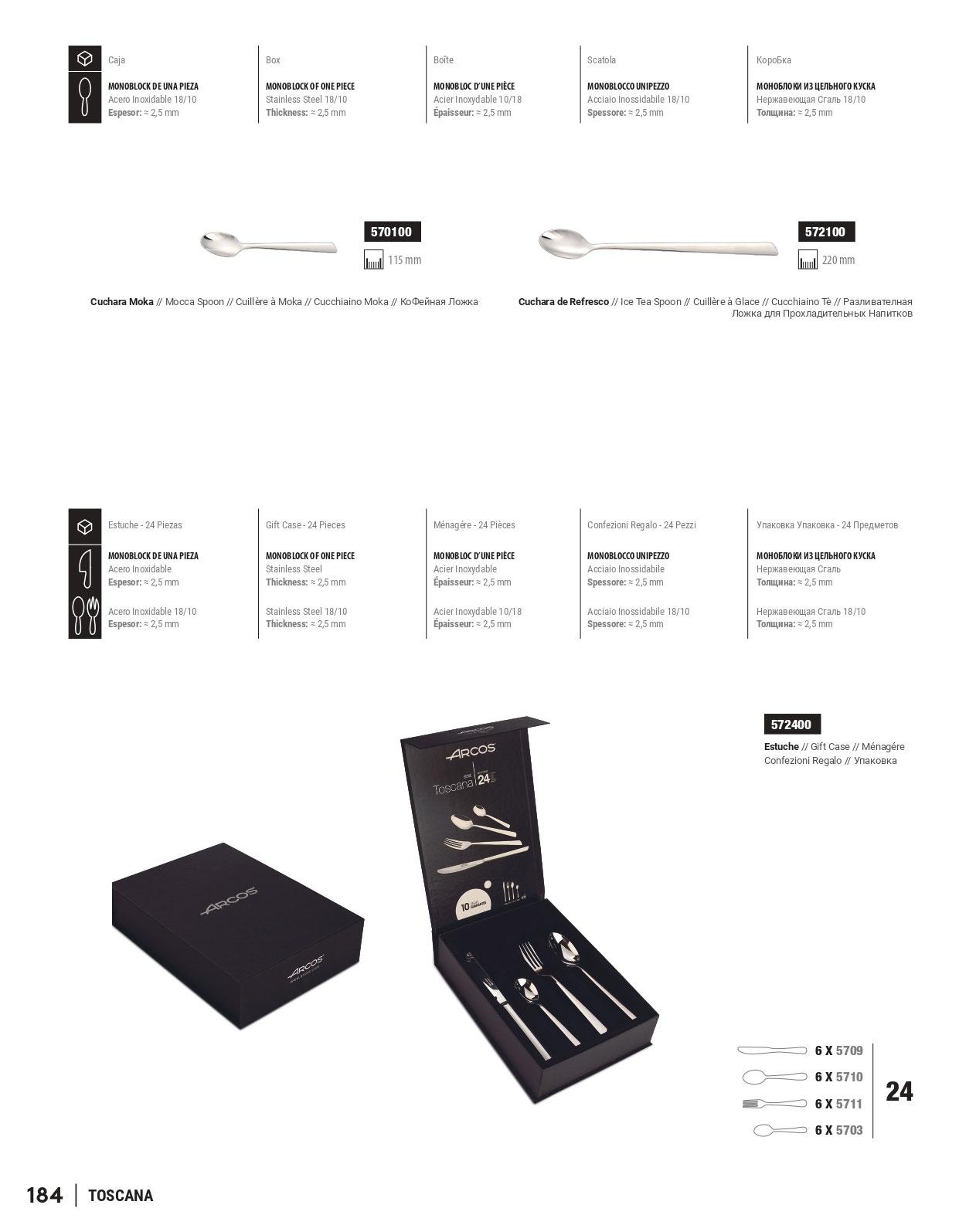 Couteaux Coutellerie, fourchettes et cuillères, en acier inoxydable d'une seule pièce monobloc. Boîte de 24 pièces. Epaisseur de 2,5 mm. Modèle Toscane.