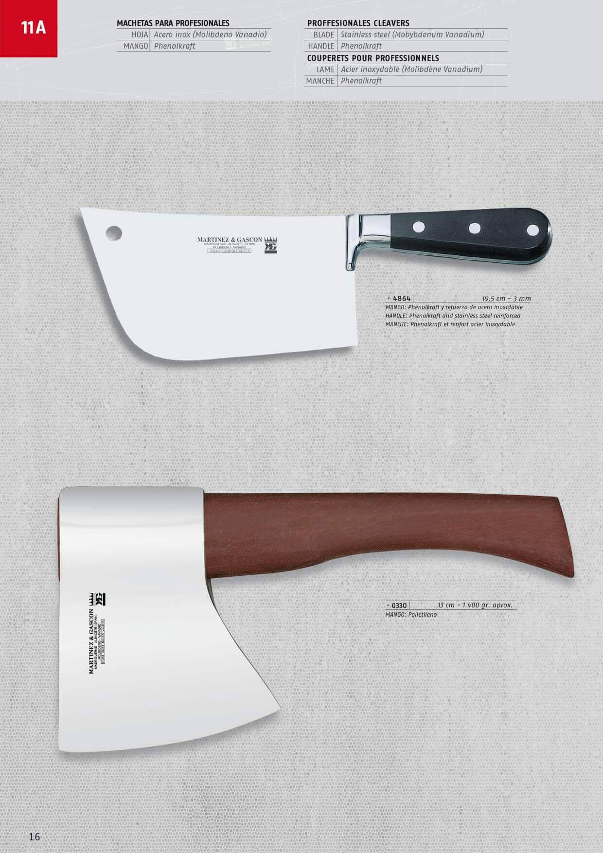 Macheta per professionisti. Maniglia in Phenolkraft e rinforzo in acciaio inossidabile. Lunghezza lama: 19,5 cm Spessore lama 3 mm.