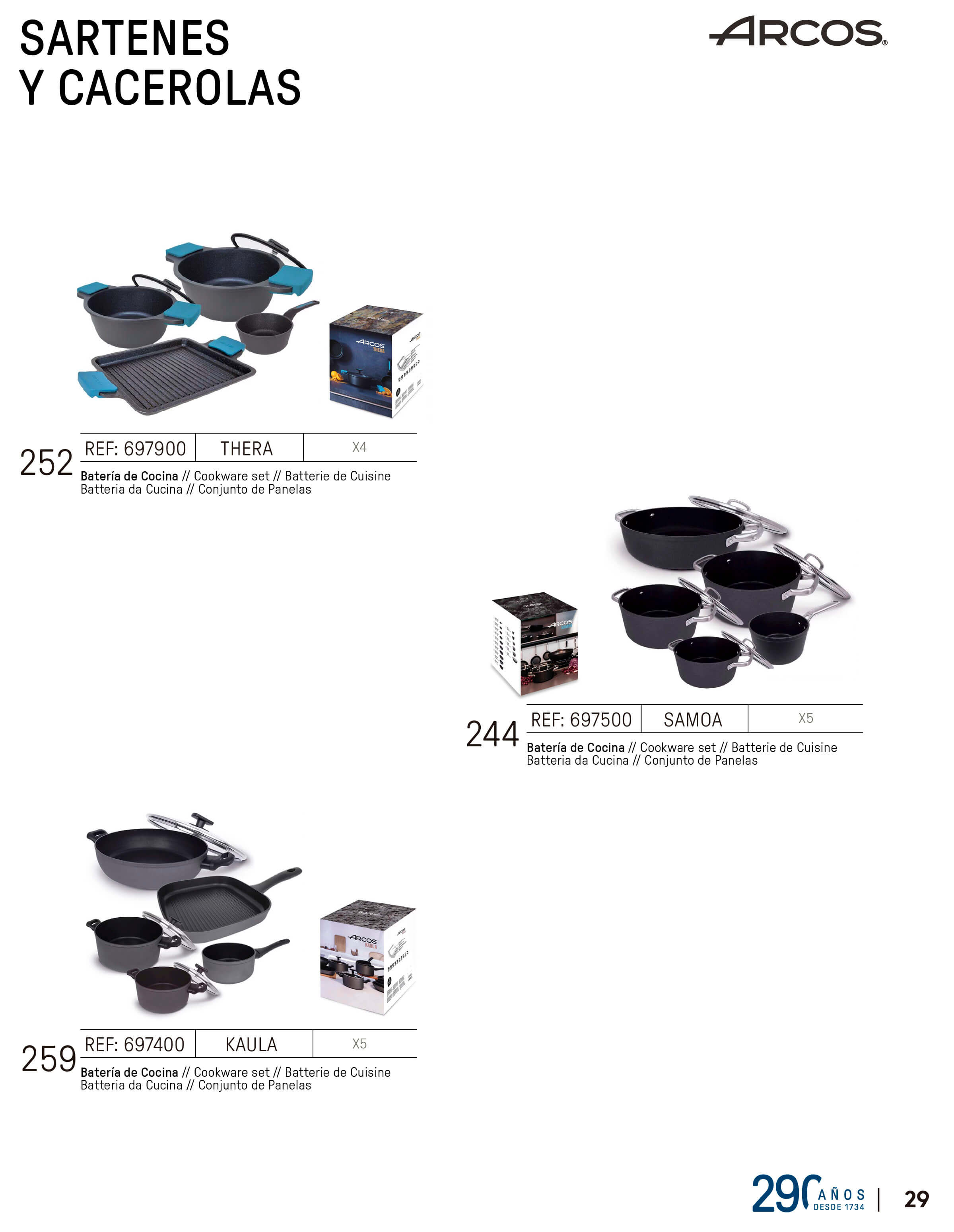 Dispone di due set di pentole: il primo, oltre alle padelle e alla casseruola, ha una griglia, mentre il secondo set ha padelle di diverse dimensioni e una casseruola. Sia il primo che il secondo set sono adatti a cucine a gas, in ceramica, elettriche e a induzione.
