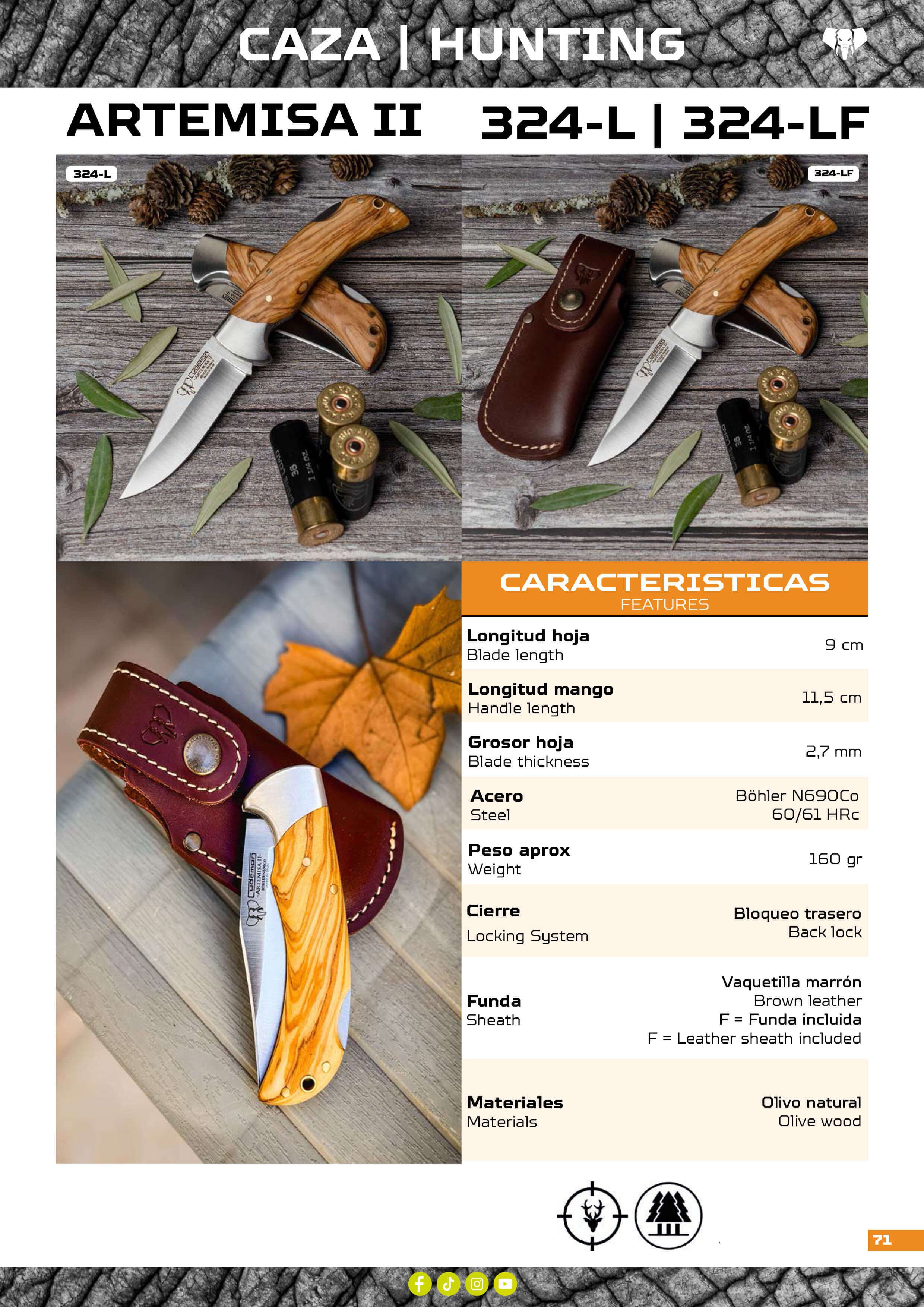 Jagdmesser mit Zwinge aus verschleißfestem MOVA-Stahl mit Backlocking-System und Clip-Point-Klingenspitze. 9,50 cm lange Klinge und satinierter, olivfarbener Griff.