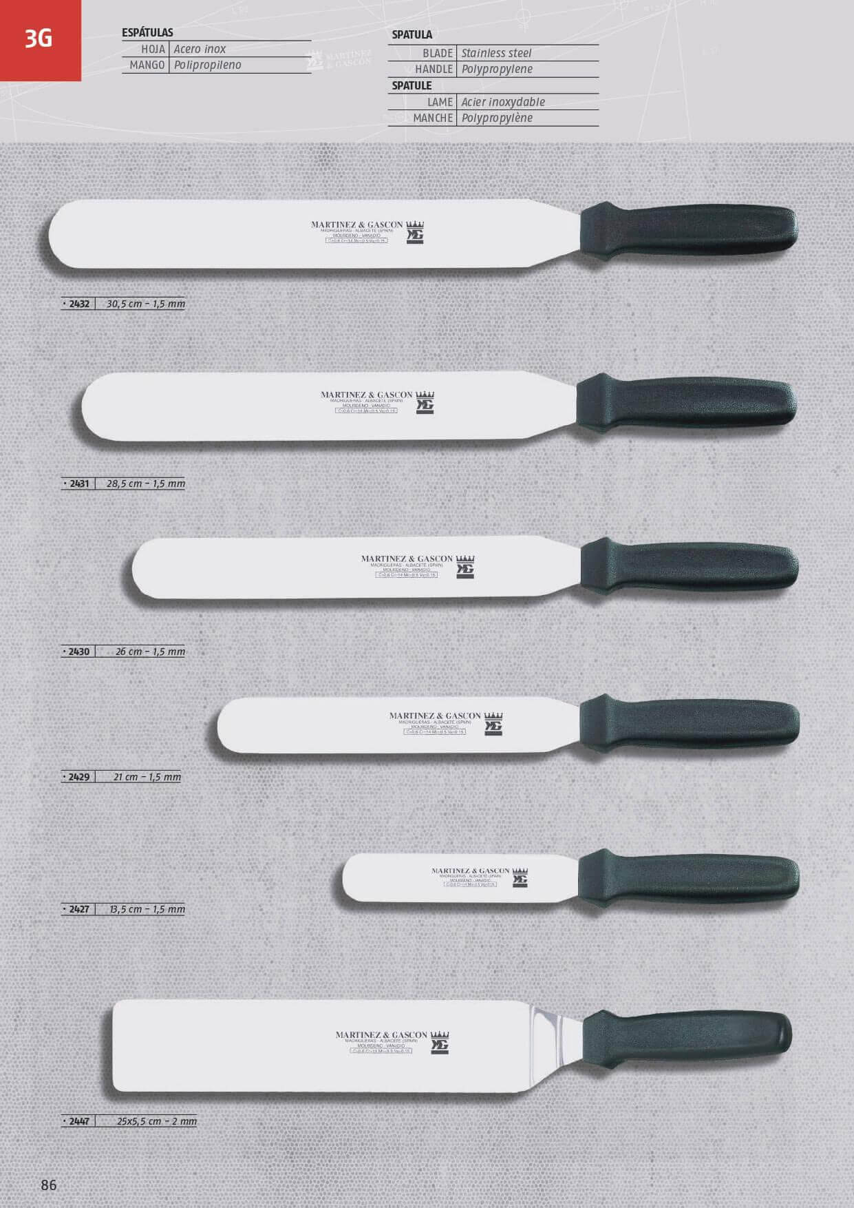 Gebäckspatel mit Griff aus Polypropylen. 1,5 mm dick Unterschiedliche Längen. 2947 25x5,5 cm abgewinkelter Spatel. 2mm dick