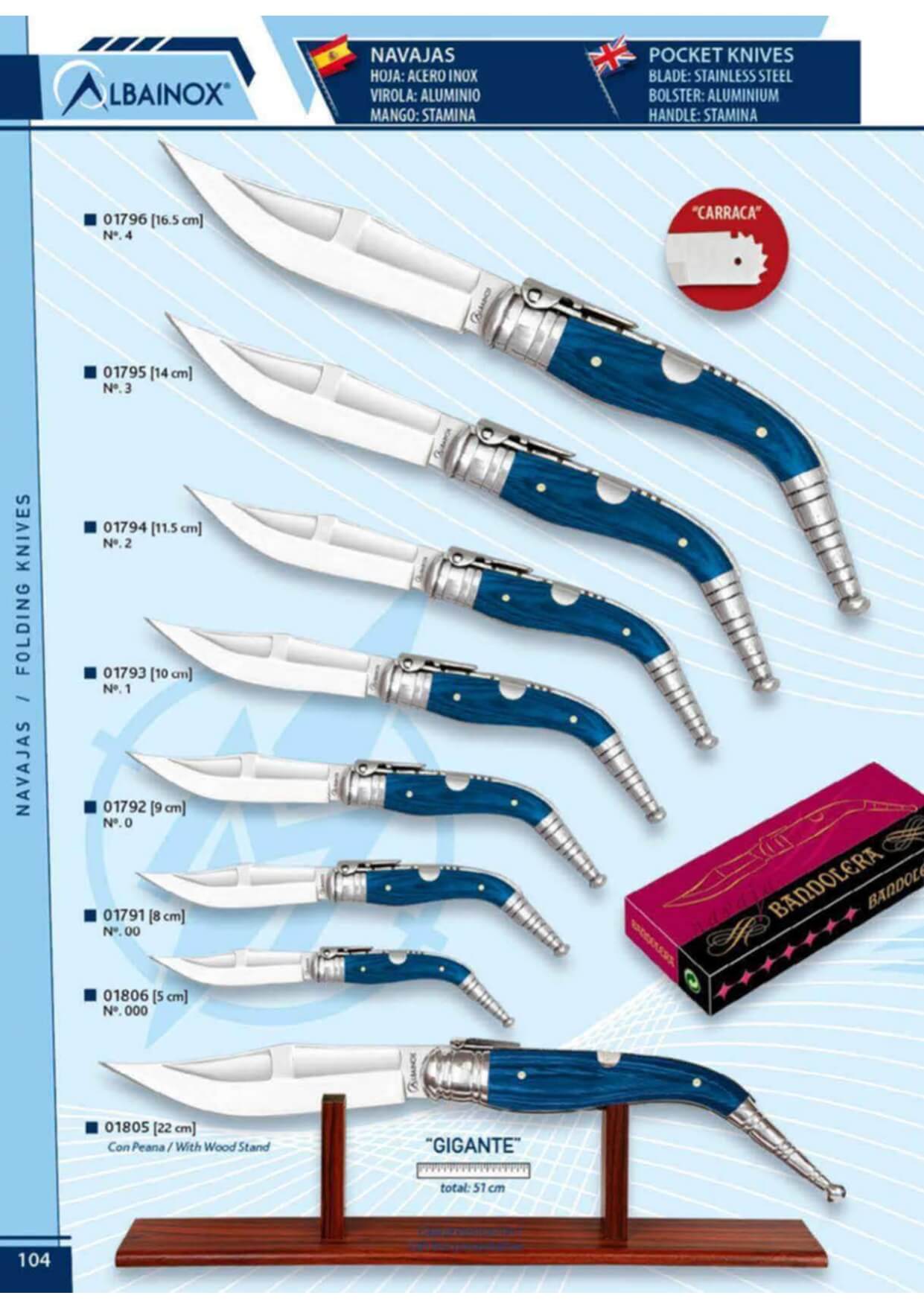 Es besteht aus acht bandoleras taschenmessern mit Ratschenmechanismus und blauem stamina griff. Was die abmessungen angeht, so hat das kleinste taschenmesser eine gesamtlänge von 11,60 cm und das größte eine gesamtlänge von 51 cm. Das längste taschenmesser verfügt außerdem über einen maßgeschneiderten sockel.