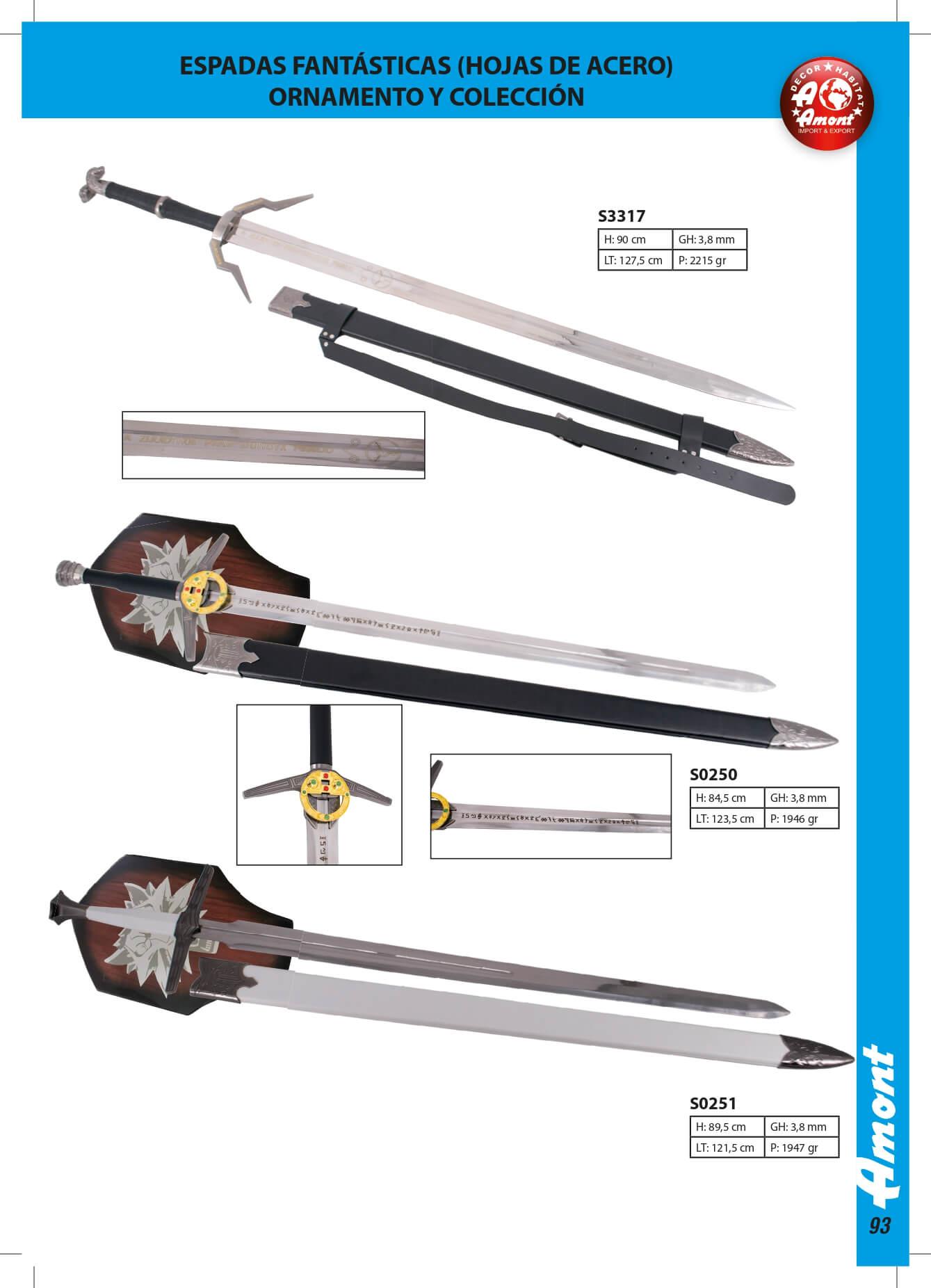 - S0251: Geralt de Rivas silbernes Schwert (The Witcher), Inoffizielle Nachbildung, ist das Modell, das in der Netflix-Serie erscheint. Mit einer Gesamtlänge von 121,5 cm, mit einem nickelfarbenen Kreuz mit Verzierungen und einem weißen Griff, einer Stahlklinge und einer weißen Lederscheide. Klingenlänge: 89,5 cm. Klingenbreite: 5 cm. Klingenstärke: 3,8 mm. Gewicht: 1,95 kg.